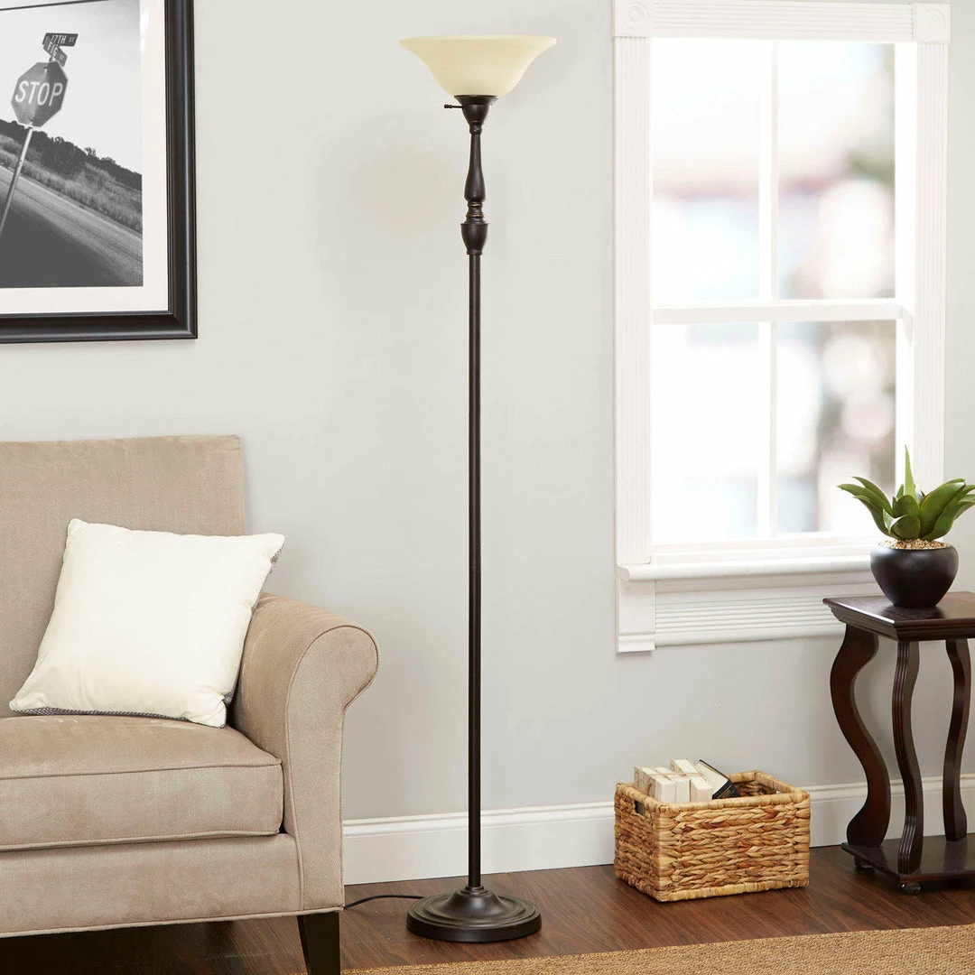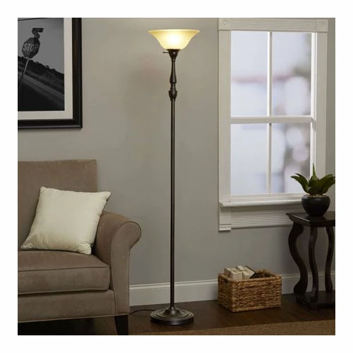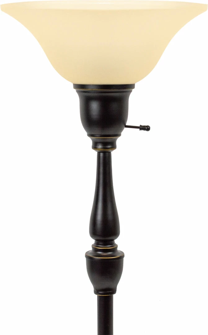 Bronzed antique style floor lamp has an amber color shade to produce warm lighting. Approximately 70″ tall with a rotary switch with the 3 way settings. Use a 3 way 150 watt bulb and go from a soft glow to a bright warm light.
