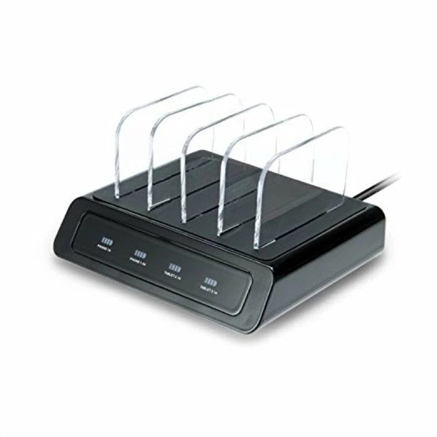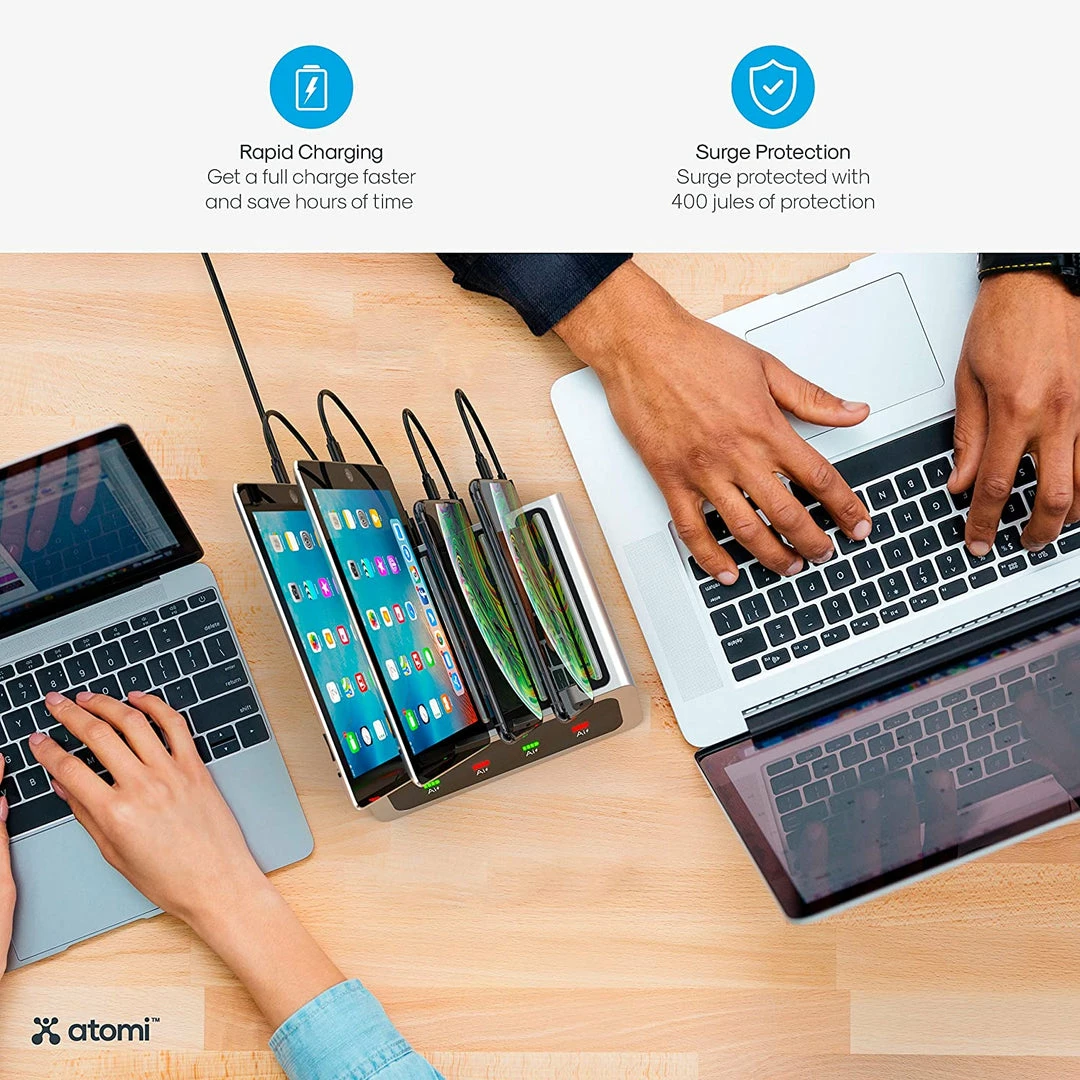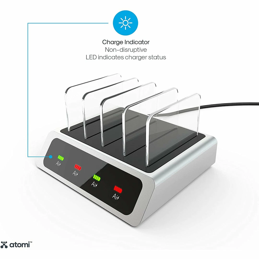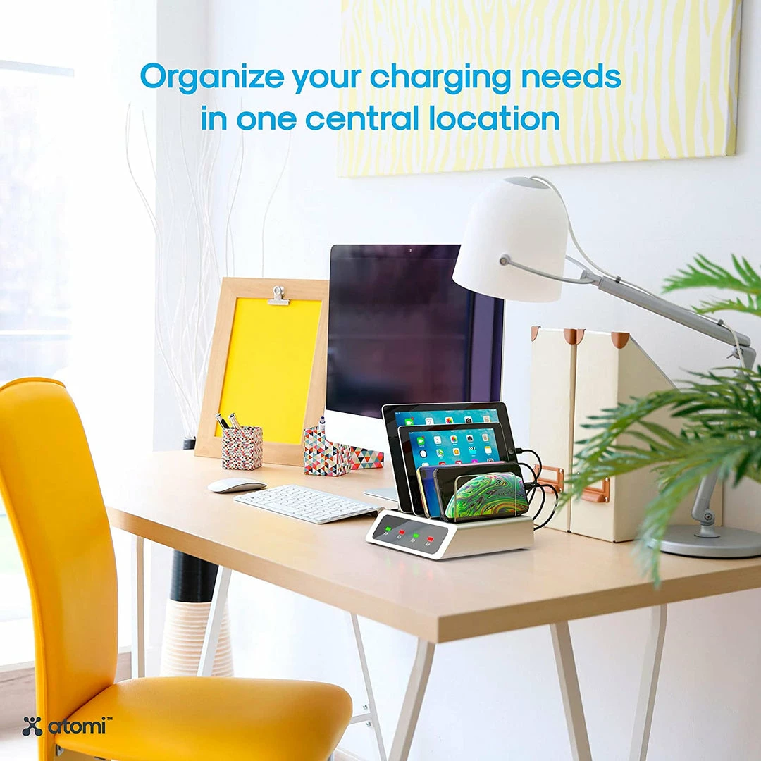 Organize and charge your household or office devices with an Atomi Desktop Charge Station! This 4 port charge station charges up to 4 devices simultaneously and features battery indicator lights that let you know when your devices are fully charged as well as surge protection up to 400 joules. A five foot cord gives you versatility in positioning your charging station, and the built in dividers help you save space. A must have for any home with multiple devices- get yours while supplies last!