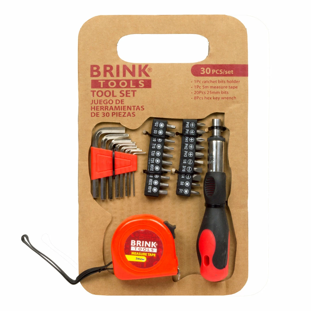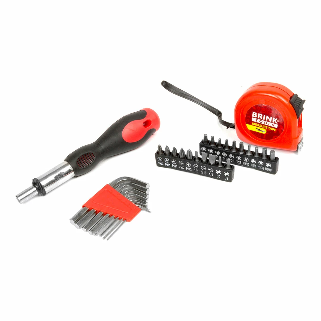 Easily handle a variety of fastening tasks with this Brink Tools Set. With an eight-piece hex key wrench, and 20 different 25mm bits, you’ll be able to handle a wide range of projects. From assembling furniture, to electronics and home repair, you’ll have the fasteners you need close at hand.