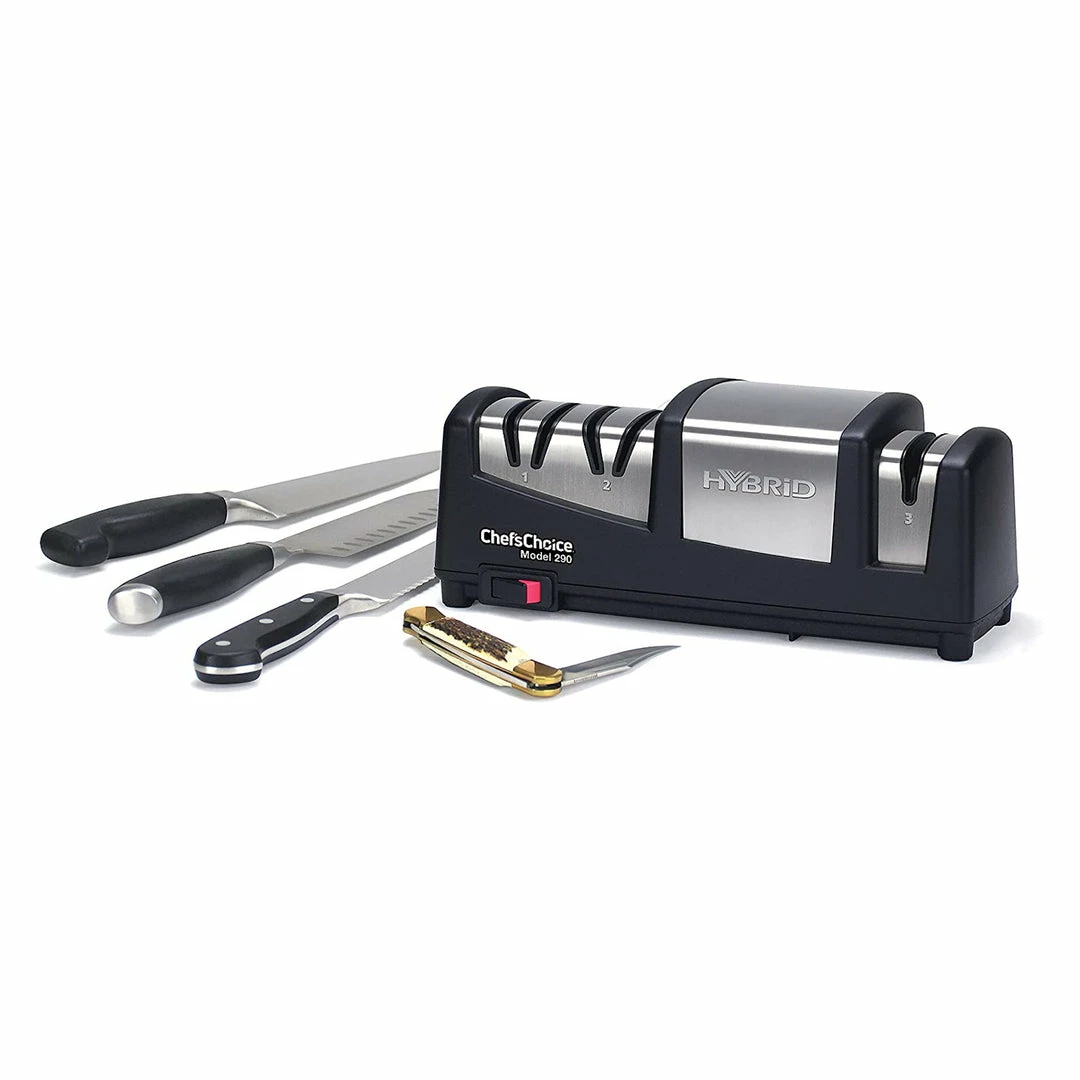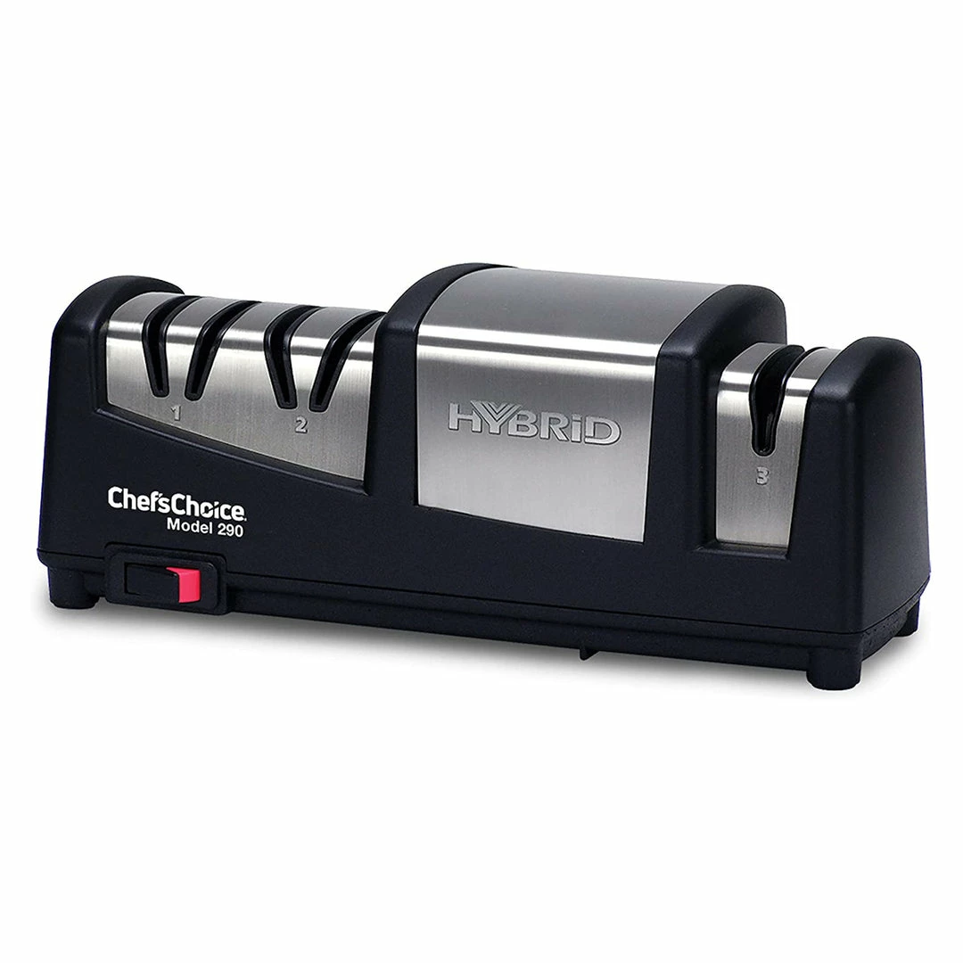 Keep your knives ultra sharp with a Chef’s Choice Sharpener! This three stage sharpener has advanced angle select technology, letting you pick between 15° or 20° edges. The process starts at either stage 1 or 2 depending on the desired angle and sharpens your knives with a 100% diamond abrasive, finishing in stage 3 with ultra fine diamond abrasives and manual sharpening- ensuring a super sharp polished edge. Efficient criss-cross sharpening technology gives an extra sharp burr free edge. It’s great for sharpening household knives, asian knives, straight and serrated knives, sports knives, and even pocket knives!