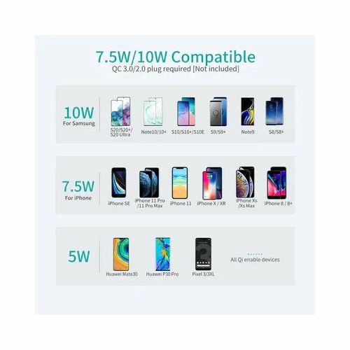 (Note: 3.0 adapter needed for fast charge); 10W for the Samsung Galaxy