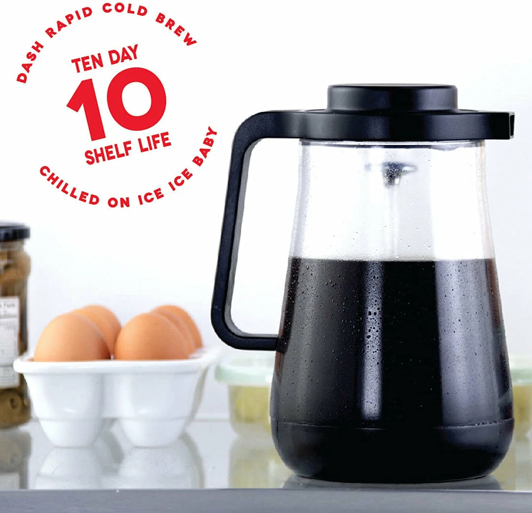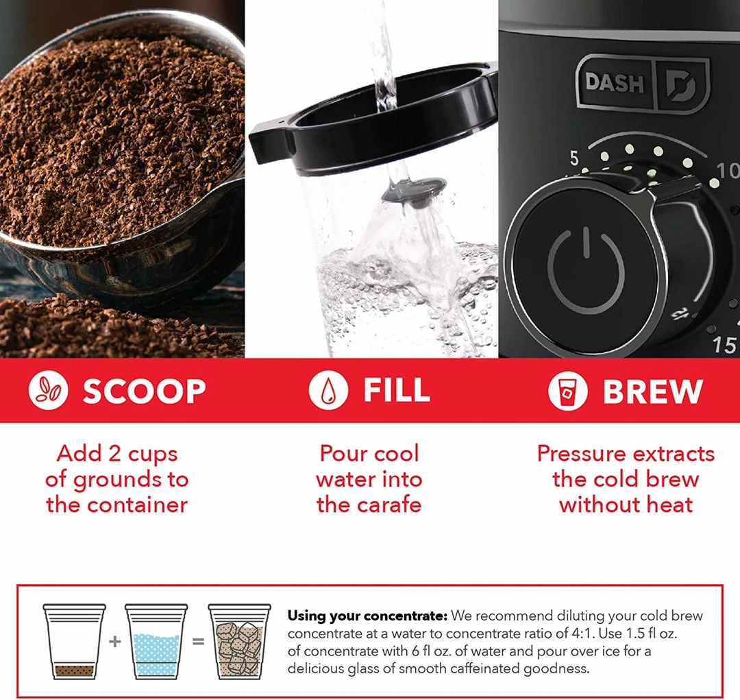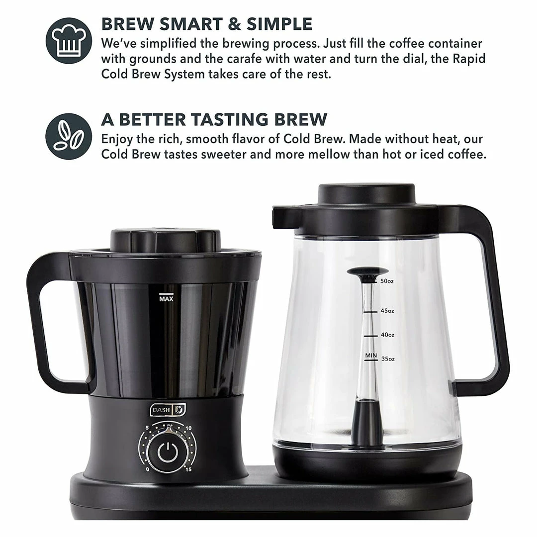 Theย DCBCM550BK Dash Rapid Cold Brew System creates rich and smooth brews of coffee. The brewer uses pressure instead of heat, extracting more flavor from the grounds and providing up to a 10 day shelf life. With rapid brewing, you can create your cold brew in as little 5 minutes, with darker brews still taking as little as 15 minutes. Cleaning is quick and easy, just run your cold brewer with just water and it will take care of the rest! Includes a 42 oz carafe, reusable filter, instruction manual, and a recipe book. Non-electrical parts are dishwasher safe.