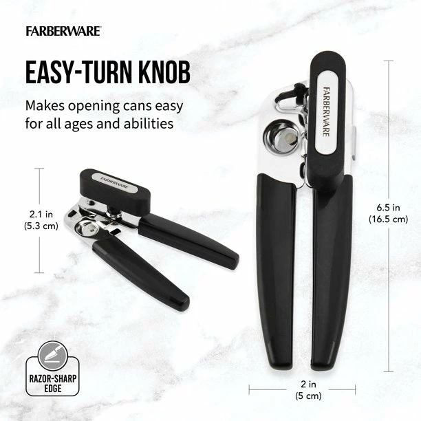 This Can Opener from Farberware makes can opening a cinch! The can opener is compact, durable, sharp, and safe to use. It features an easy turn knob, polished chrome head and ergonomic grip.