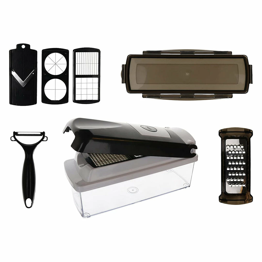 Chop, slice, and dice your vegetables with a Feros 8-in-1 Chopper Set! This 8 piece set comes with everything you need to cut just about any shape you need- from french fry cuts to even apple slices and more! Everything is dishwasher safe, easy to store, and requires low power to use. The set includes a press lid with 4 blade attachments, an attachable container, lid, and even an extra hand slicer.