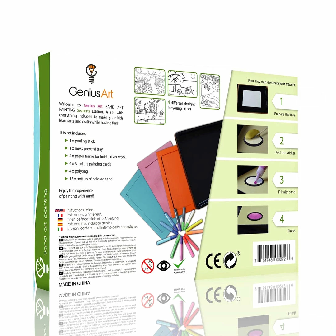 - Includes – Peeling Stick, Mess Prevent Tray, 4 Paper Frames, 4 Painting Cards, 4 Poly Bags, 12 Bottles of Colored Sand