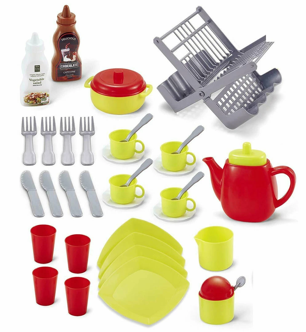 Art! This play set includes 40 pieces- everything needed to have a “Tea Party”! Included in the box is 1 salad dressing, 1 chocolate syrup, 4 knives, 4 forks, 4 teaspoons, 4 plates, 4 glasses, 4 teacups, 4 tea plates, 1 teapot, 1 milk jar, 1 sugar jar, 1 dish drying rack, and 1 stock pot.