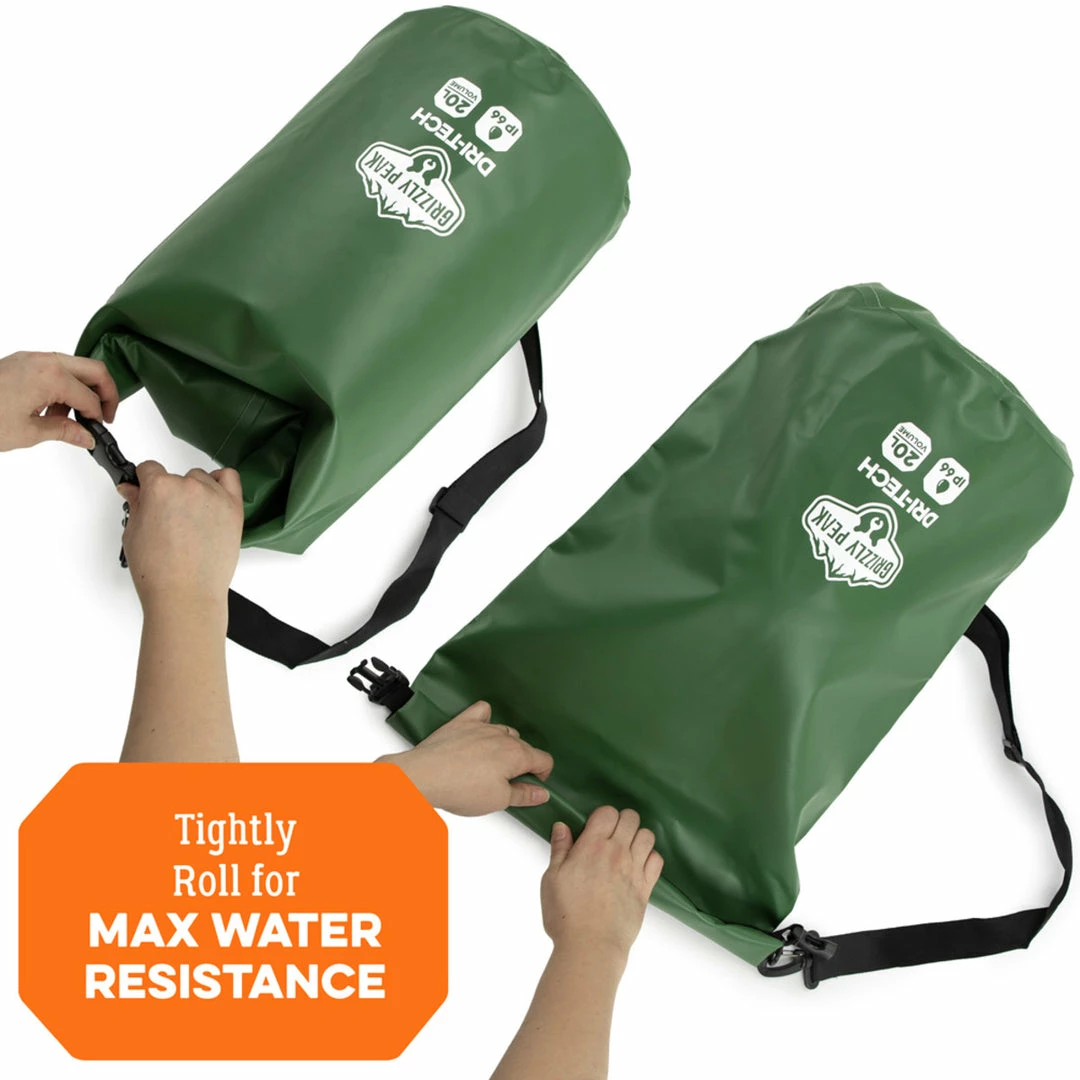 Dri-Tech dry bags come in four sizes: 10L, 20L, 30L, and 40L. The 10L bag is great for small trips and small valuables. 20L bags are day trip size and can hold a moderate amount of possessions. 30L bags are perfect for trips lasting 2-3 days and hold normal possessions and may fit bigger items like water containers and survival gear. 40L bags are the perfect for weeklong trips and can hold extra things like clothes, a small sleeping bag, and a blanket as well as the usual possessions.