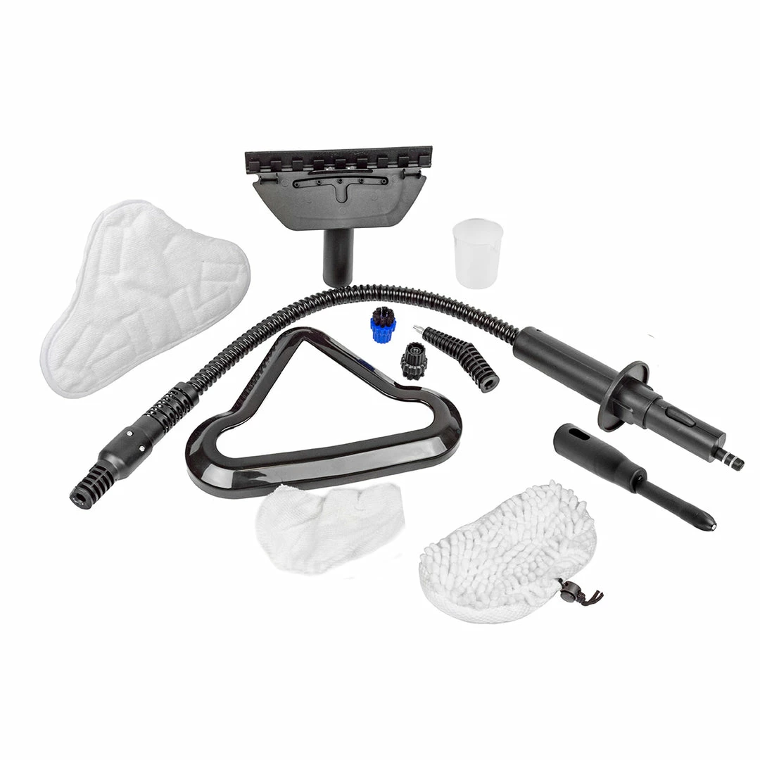 - Includes: microfiber mop cloth for mop head, window cleaning coral cloth, garment steaming cloth, glider, 2-round nylon brushes, extension hose, jet nozzle, window cleaning tool, cleaning pin, strap for hand-held steamer, and measuring cup