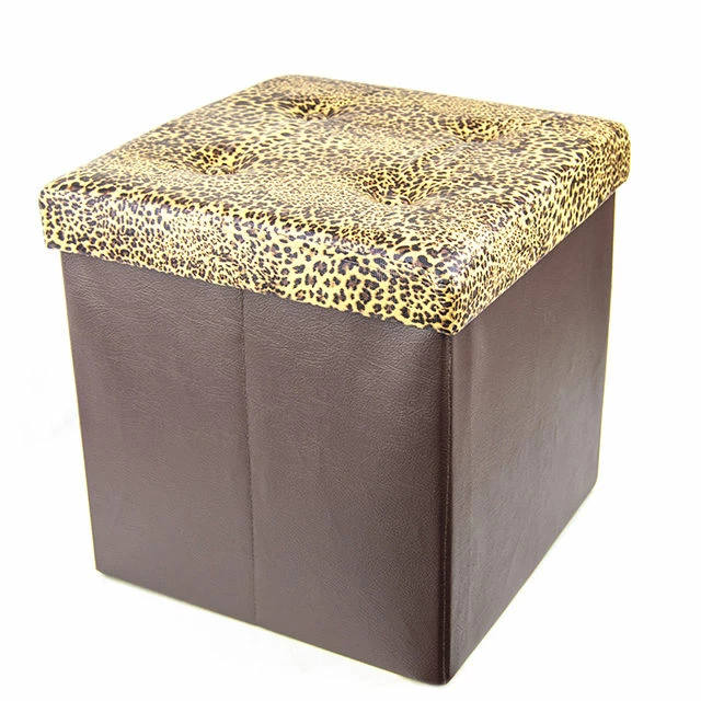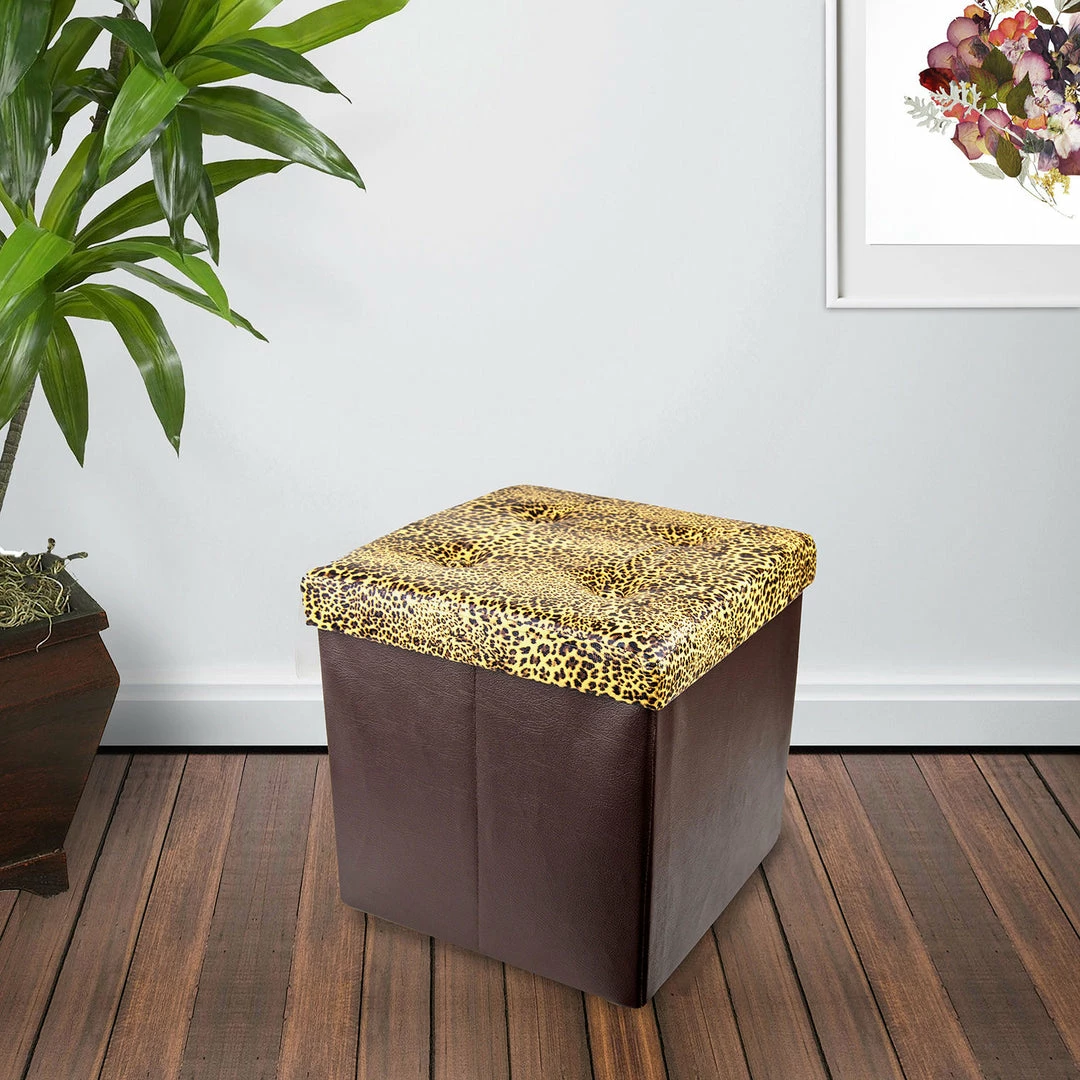 Enjoy storage and comfort in style with a Homz Collapsible Ottoman. A simple, practical way to declutter your home, these vibrant leopard print-lid collapsible storage ottomans make for eye-catching footstools, impromptu coffee tables, or sturdy, comfortable seating, as well as storing shoes, books, toys, or whatever else you need. Plus, they fold up into a small storage size when not in use; utility and style when you want it, out of the way small-profile when you don’t. A fun and functional addition to living room, den, bedroom, or dorm room decor.