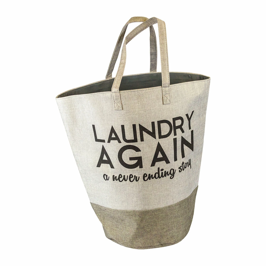 - Spacious laundry bag with lettering that says “LAUNDRY AGAIN a never ending story”
