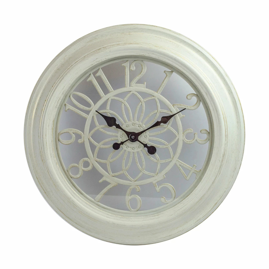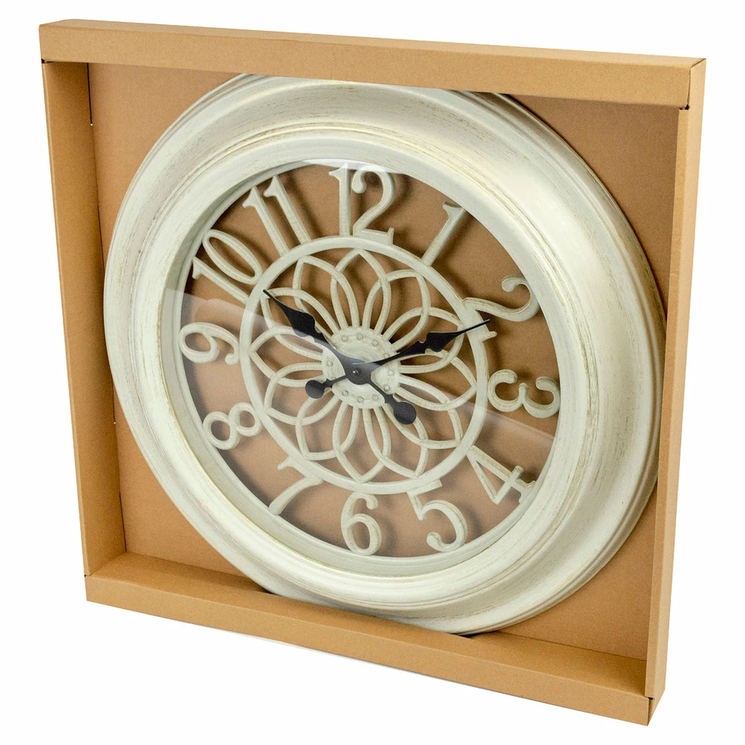 Intellibrands 22.5” White Antique Finish Wall Clock has a white antique finish, an intricate flower petal clock face, and large raised numbers! These clocks are 22.5 inches in diameter, beautifully crafted and designed with a touch of elegance. The perfect addition to any wall or above a fireplace, it’s sure to be a conversation piece where ever you place it in your home!