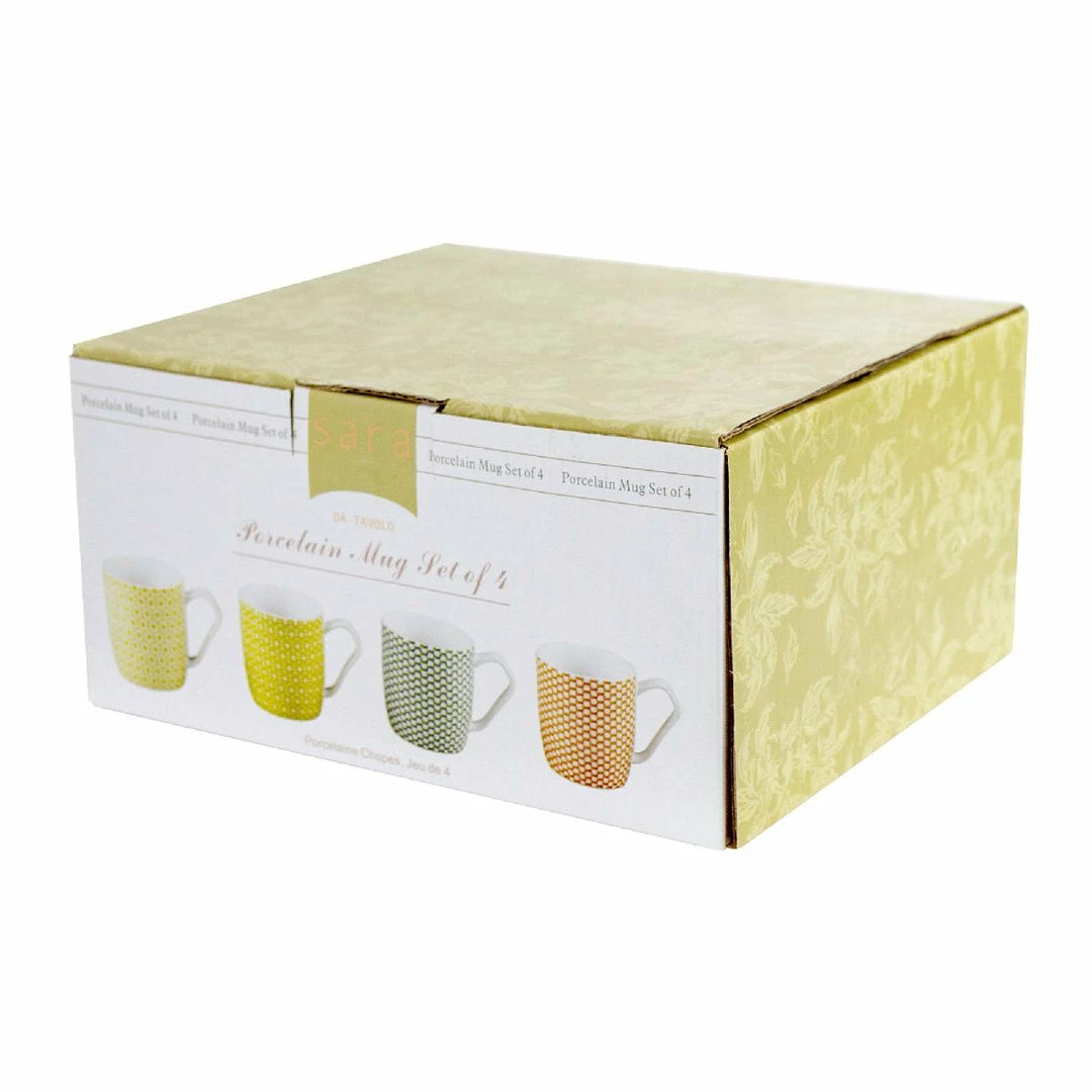 ย This Sara Da Tavolo Porcelain Mug Set comes in lovely interwoven wheel and thread patterns in various colors. The mugs are 16oz and come in a set of 4. The bright colored patterns are sure to look great in your kitchen or coffee brewing station! Perfect for any drink, hot or cold.