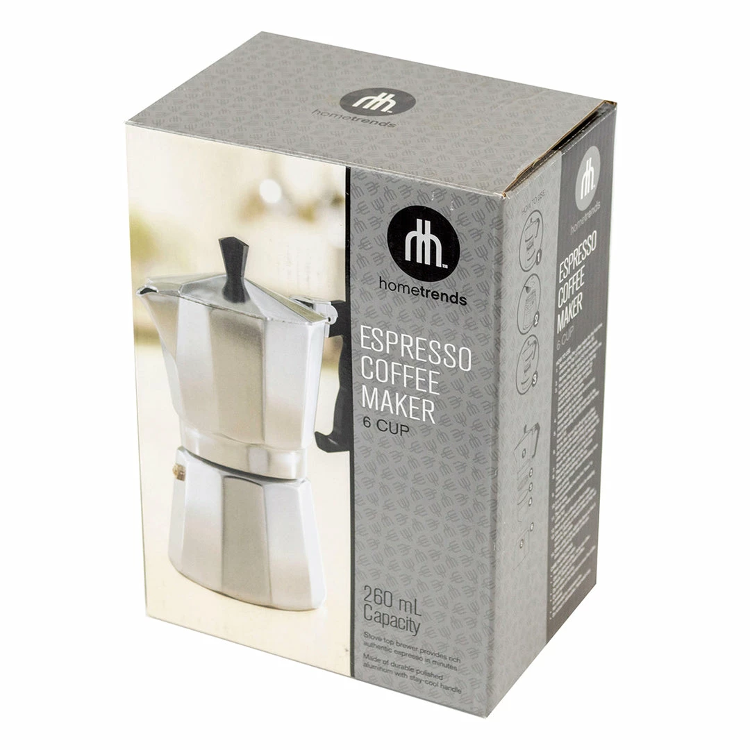 Home Trends 6 Cup Aluminum Espresso Maker is easy to use and makes authentic espresso in minutes!ย Just fill the lower chamber with water, place your ground espresso in the filter, assemble and then place on the stovetop to brew.ย It provides the even heat distribution required to produce the perfect cup of espresso.ย The safety release valve also helps to ensure proper flavor every time.ย Get ready to experience the espresso at its finest!