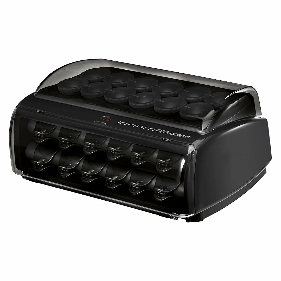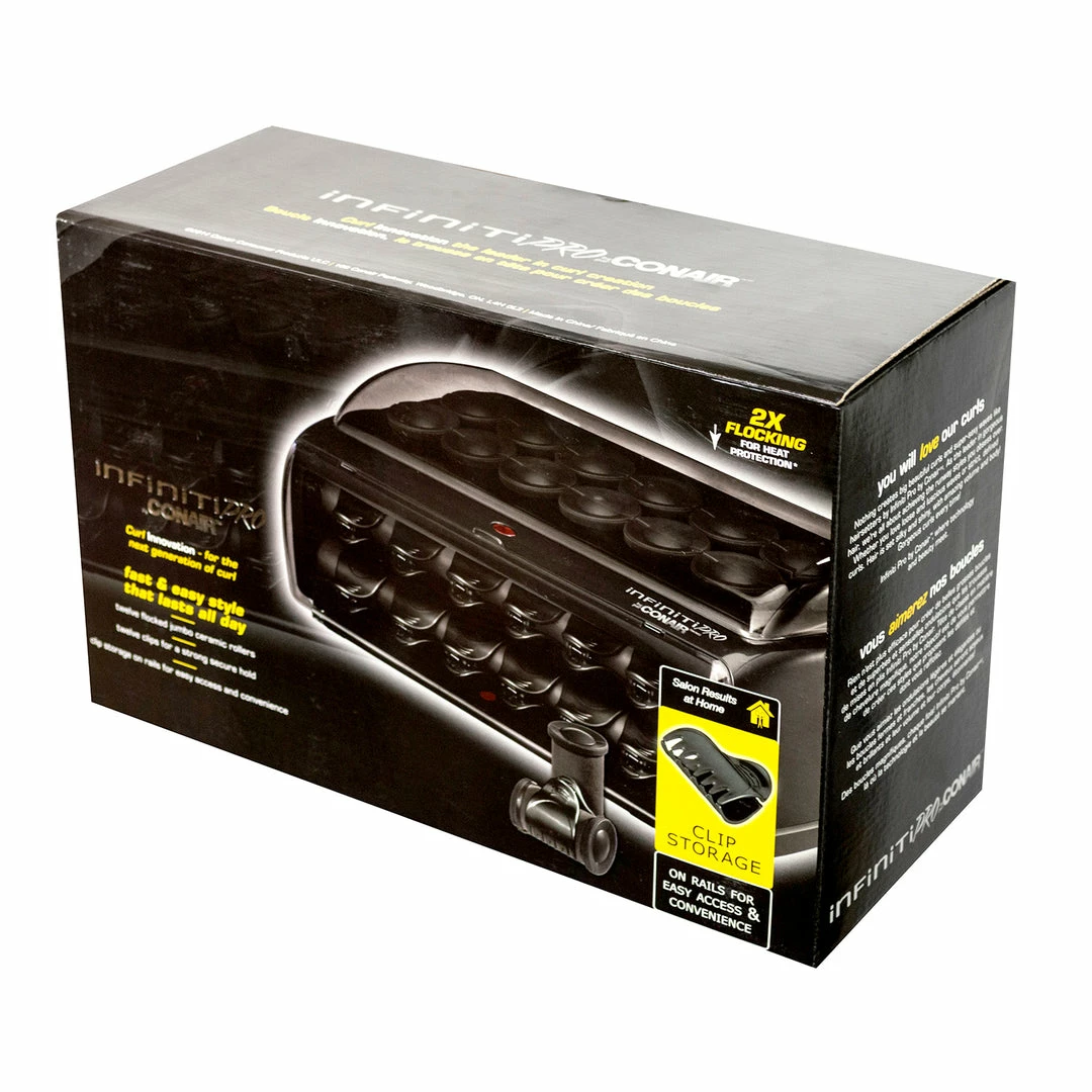 Achieve big luscious curls with a Conair Infiniti Pro Hair Setter! This curler uses ceramic infused technology to provide gentle and even heat that keeps your hair styled all day. It includes 12 jumbo sized rollers that are 2X flocked, giving more heat protection on all hair types. It also includes 12 clips with rail storage for easy and convenient access.