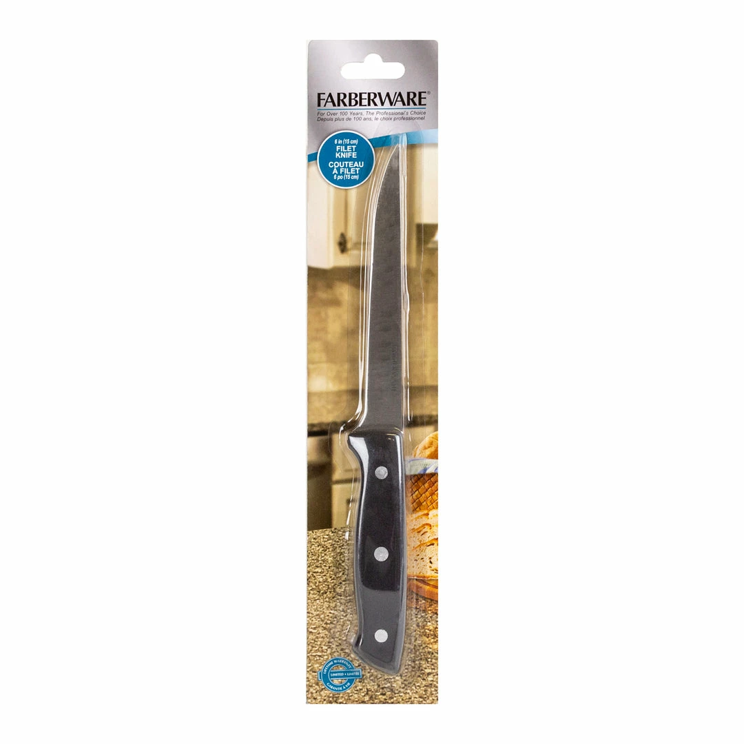 Farberware Triple Rivet 6 in Stainless Steel Filet Knife is made of high-carbon stainless steel for a fine cutting edge. It’s ergonomically designed and perfectly balanced for comfort and control. The triple rivet provides extra strength and durability.