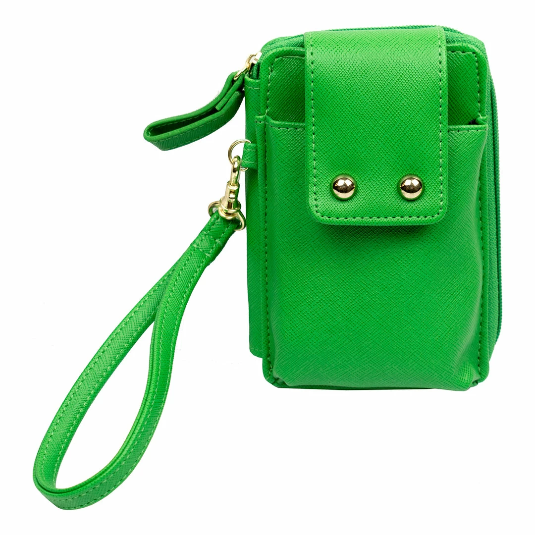 The Green Wallet Cell Phone Wristlet is perfect for a night out on the town or for daily shopping trips!Β It is a fun and trendy cell phone holder that doubles as a wallet.Β This zippered wallet features a clear pocket for photo ID, 4 credit card pockets, cash pocket, hidden pocket and zippered change pocket.Β Thereβs a snap closure and pocket on the front for your cell phone keeping everything you need at your fingertips!