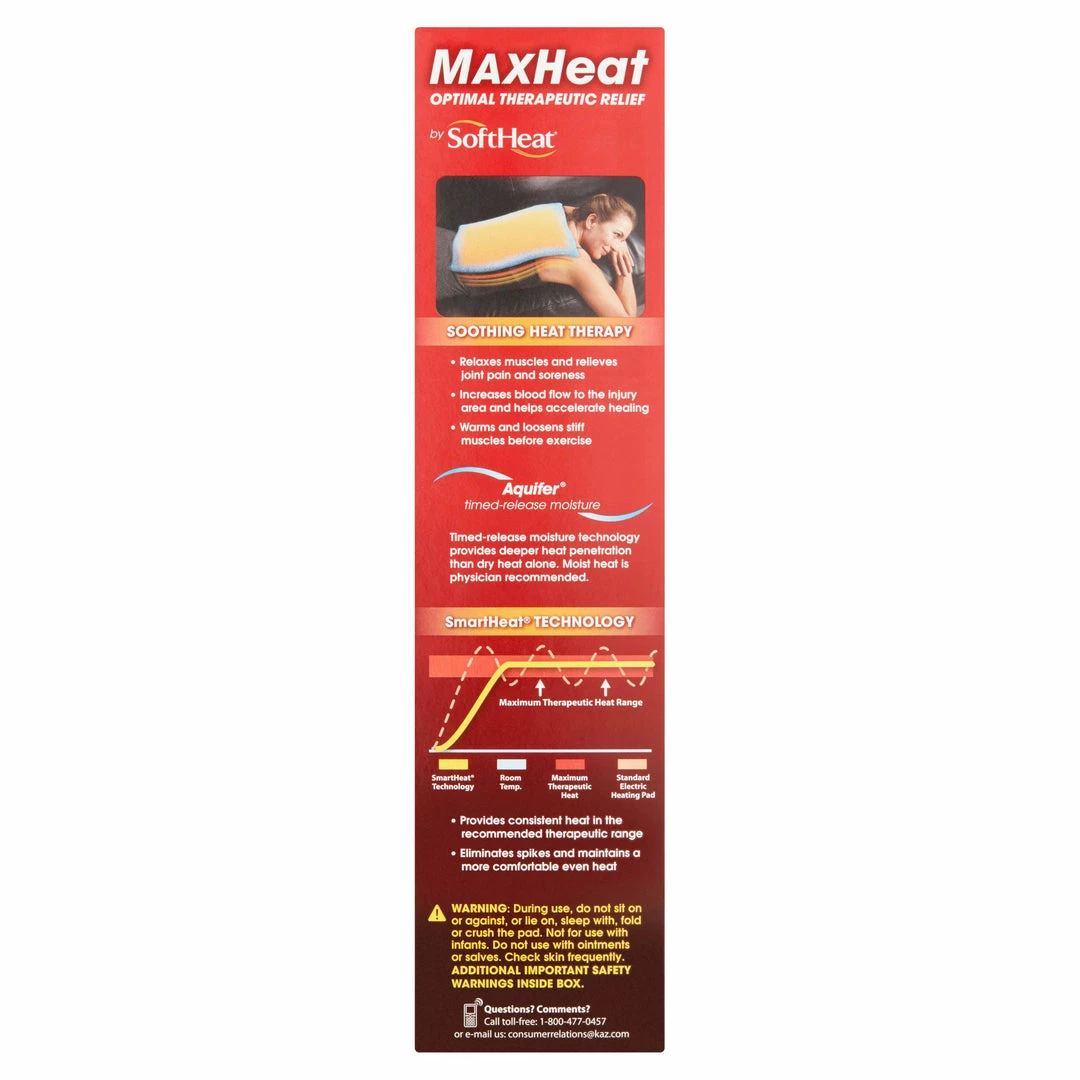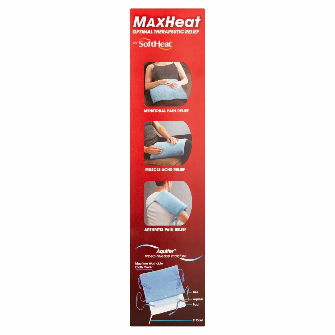 The Max Heat Heating Pad by Soft Heat, Refurbished, offers a unique heat therapy with timed-release moisture. Moist heat provides deeper heat penetration than dry heat alone and is physician recommended. The heating pad can be used to relax muscles and relieve joint pain and soreness by increasing blood flow to the injury area and help accelerate healing. You can also use it to warm and loosen stiff muscles before exercise. A controller gives you 4 heat settings and has a 60 minute auto-off feature. The pad is 12″ x 15″ and has a machine washable cover with ties.