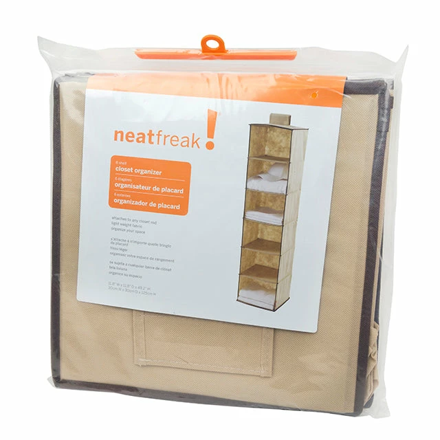 There’s nothing better than the warm feeling you get from a decluttered and organized closet- and the Neat Freak 6 Shelf Closet Organizer is here to do just that! This lightweight contemporary designed shelf slots conveniently on any closet Rod, and has tons of space! You can store your towels, hats, shoes, clothes, makeup, and more! It comes in a welcoming neutral tan and brown coloring that will look excellent in most homes.