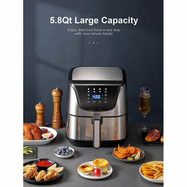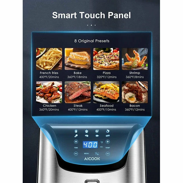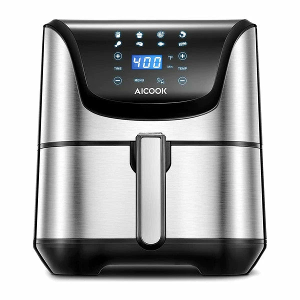 Get professional quality cooking results with an AICOOK Air Fryer! This air fryer uses air circulating technology to cook and bake your food efficiently and evenly from all directions. It has a large 5.8 quart capacity and features an LED touch screen with 8 cooking presets. You can set the timer from 1-60 minutes, and the temperature range goes from 180ยฐF to 400ยฐF. User Manual included, accessories dishwasher safe.