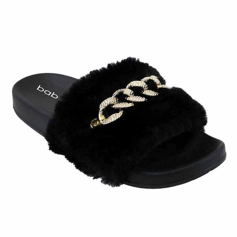 Keep your feet comfortable in style with a pair of Babe Fur Slides! These slides can be used outdoors or indoors as slippers and feature rubber bottoms and a faux fur design embellished with a fun plastic chain. They come in a variety of colors and sizes – get them now at a bargain while supplies last!