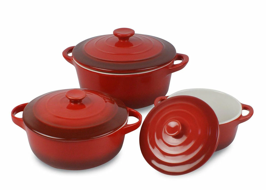 This stoneware casserole dish set features a glazed two-tone red enamel finish