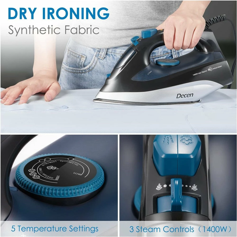 Keep your wardrobe wrinkle-free with a Decen Steam Iron! This 1400 watt steam iron is easy to use and features 5 temperature settings and 3 steam settings. It’s suitable for most fabrics including cotton, linen, silk, wool, synthetics and more. Included with the steam iron is a user manual and a 200ml water cup.