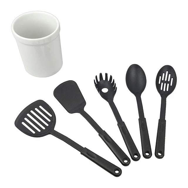 Let the Farberware Nylon Tool Set with Ceramic Crock bring out your inner chef! The white ceramic crock comes with a solid spoon, slotted spoon, pasta fork, spatula, slotted turner, and ladle. The tools are highly heat resistant to 400 Degrees F (204 Degrees C). Everything you need to cook up a masterpiece is within reach!