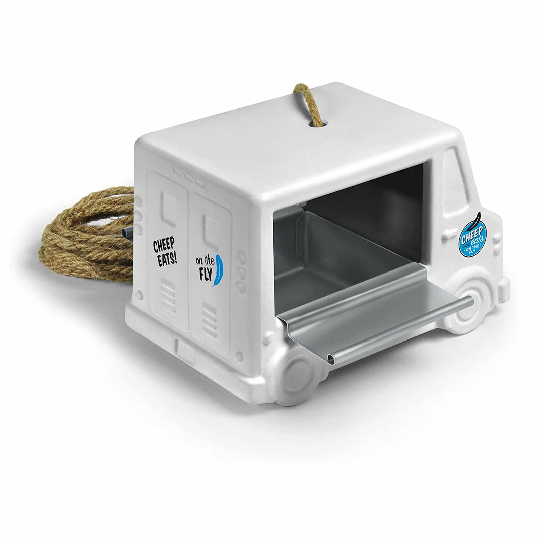 Bring curbside service to your birds with this Truck Bird Feeder from Genuine Fred! This ceramic bird feeder is the perfect gift for any bird lover- it features fun “Cheep Eats On The Fly” decals, easy to clean steel alloy seed tray with perch, and comes with thick twine for hanging.