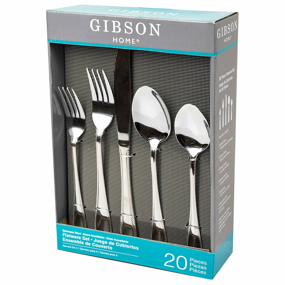 Set a distinctive table with this elegant Gibson Flatware. This elegant flatware set has everything you need to create complete table settings – salad forks, dinner forks, dinner knives, dinner spoons, and teaspoons – enough for four place settings. Brilliant and functional, with an elegant and unique handle design, this flatware will be a staple of meals for years to come.