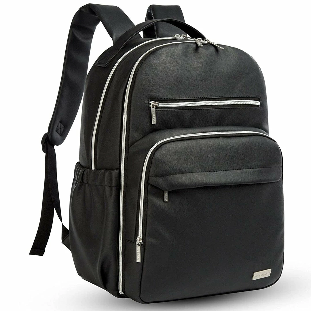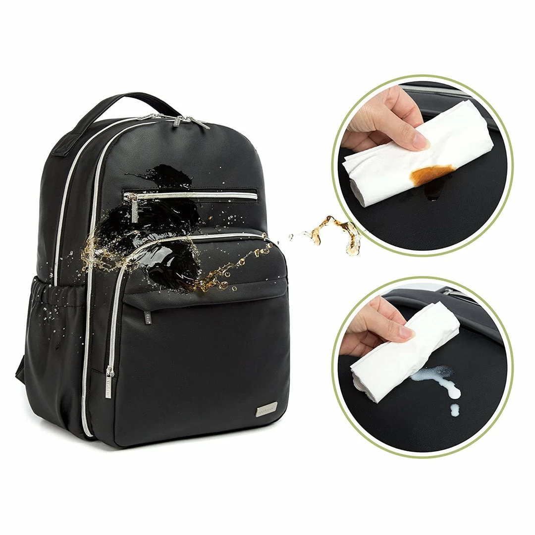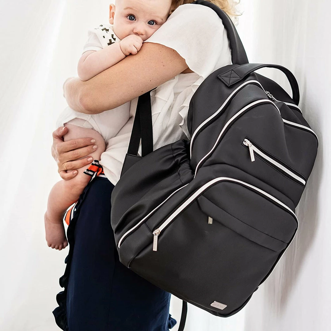 The KeaBabies Diaper Bag Backpack is designed to combine sleekness with utility. Made from waterproof vegan leather, the bag features tons of storage with a large main compartment, easy access zipper pockets, water bottle pockets, and a secondary compartment. It has a large carrying handle and is extremely easy to clean, offering top of the line convenience.