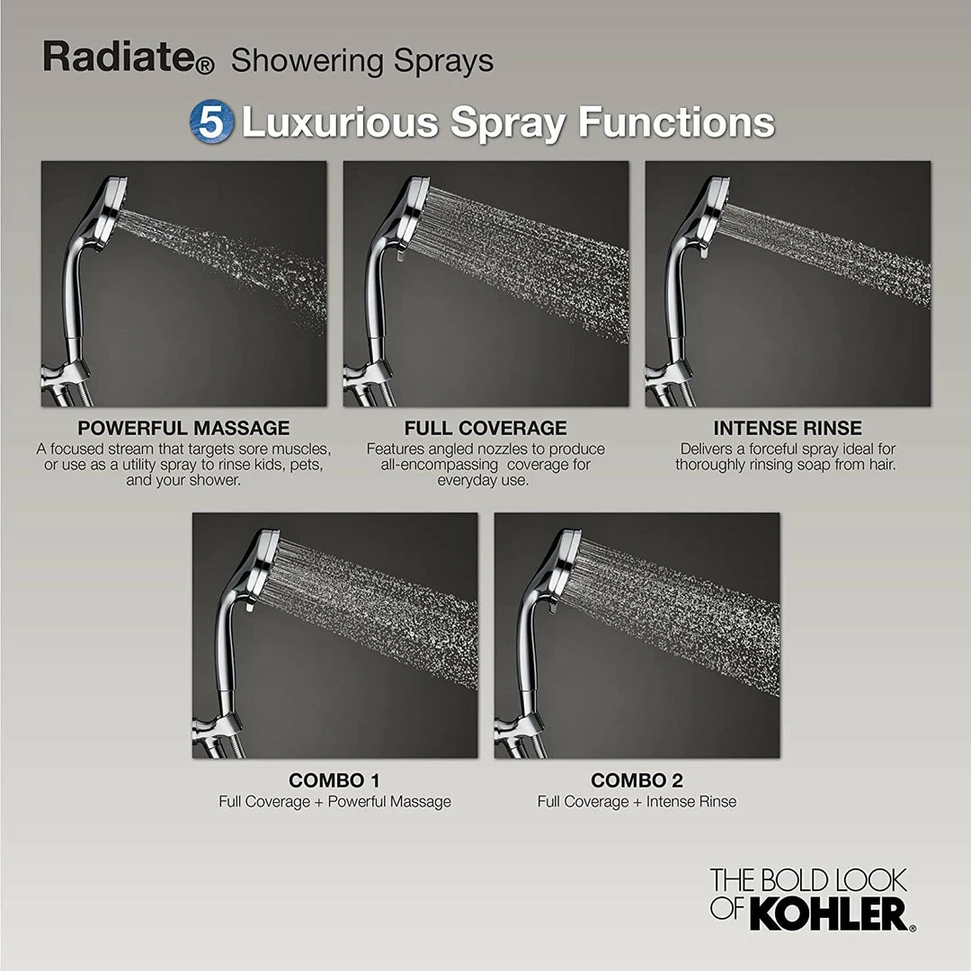 The Radiate handshower delivers five luxurious experiences that will immediately upgrade your shower. Select from five different sprays with a simple rotation of the thumb tab – full coverage, intense rinse, powerful massage, or two combination sprays that allow you to enjoy multiple settings at once. Radiate’s sleek design brings a stylish accent to the contemporary and classic bathroom. This self-sealing handshower offers fast, easy installation, with no tools or tape required.