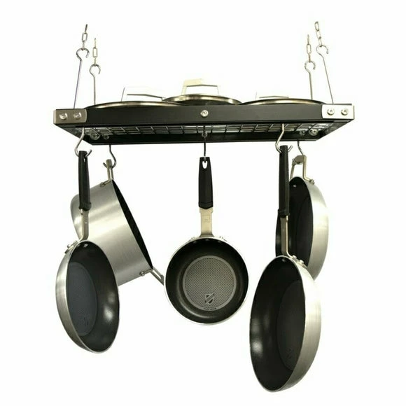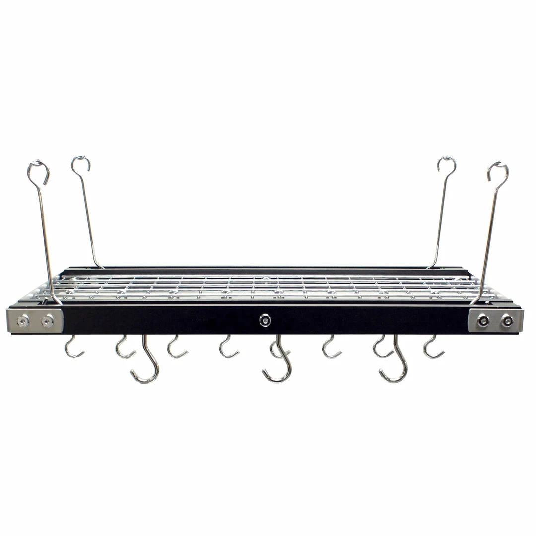 Keep your kitchen organized and free up cabinet space with a Range Kleen Pot Hanging Rack! This wood and stainless steel rack mounts on your ceiling and comes with 8 repositionable hooks to hang your pots and pans, saving them from scratches and dents caused by stacking. Installation hardware and use/care guide included.