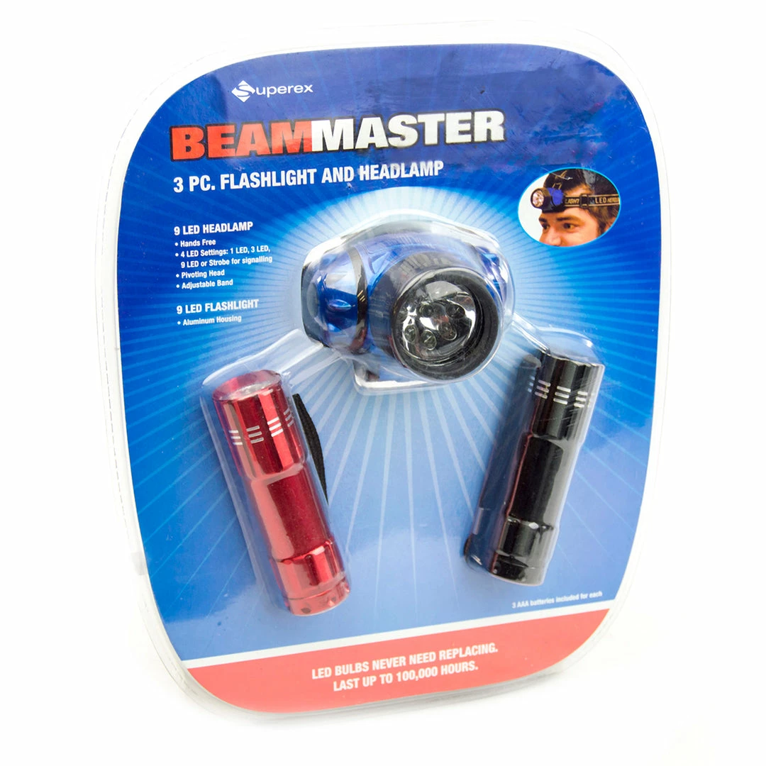 Equip your family for a camping trip with a Beastmaster 3 PC Flashlight & Headlamp Combo.ย This set includes a 9 LED headlamp and 2- 9 LED flashlights as well as 9 AAA batteries.ย Everything you need to have a fun filled outdoor adventure without being left in the dark!