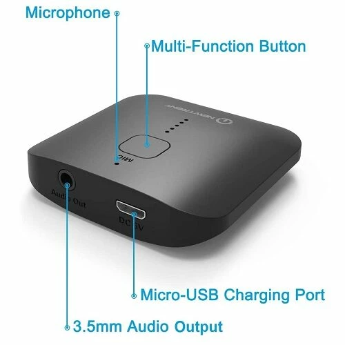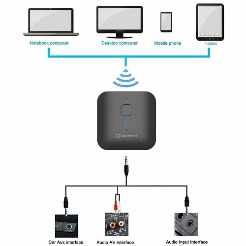 New Trent Bluetooth Wireless Receiver allows you to connect to any Bluetooth device and transmit Audio wirelessly. Connect up to two Bluetooth devices at the same time. Use it to connect your home or car audio system with a 3.5mm AUX cord and the built-in microphone allows you to use it for Hand-Free Calling. The rechargeable battery makes this super portable with up to 12 hours of talk and playing time!