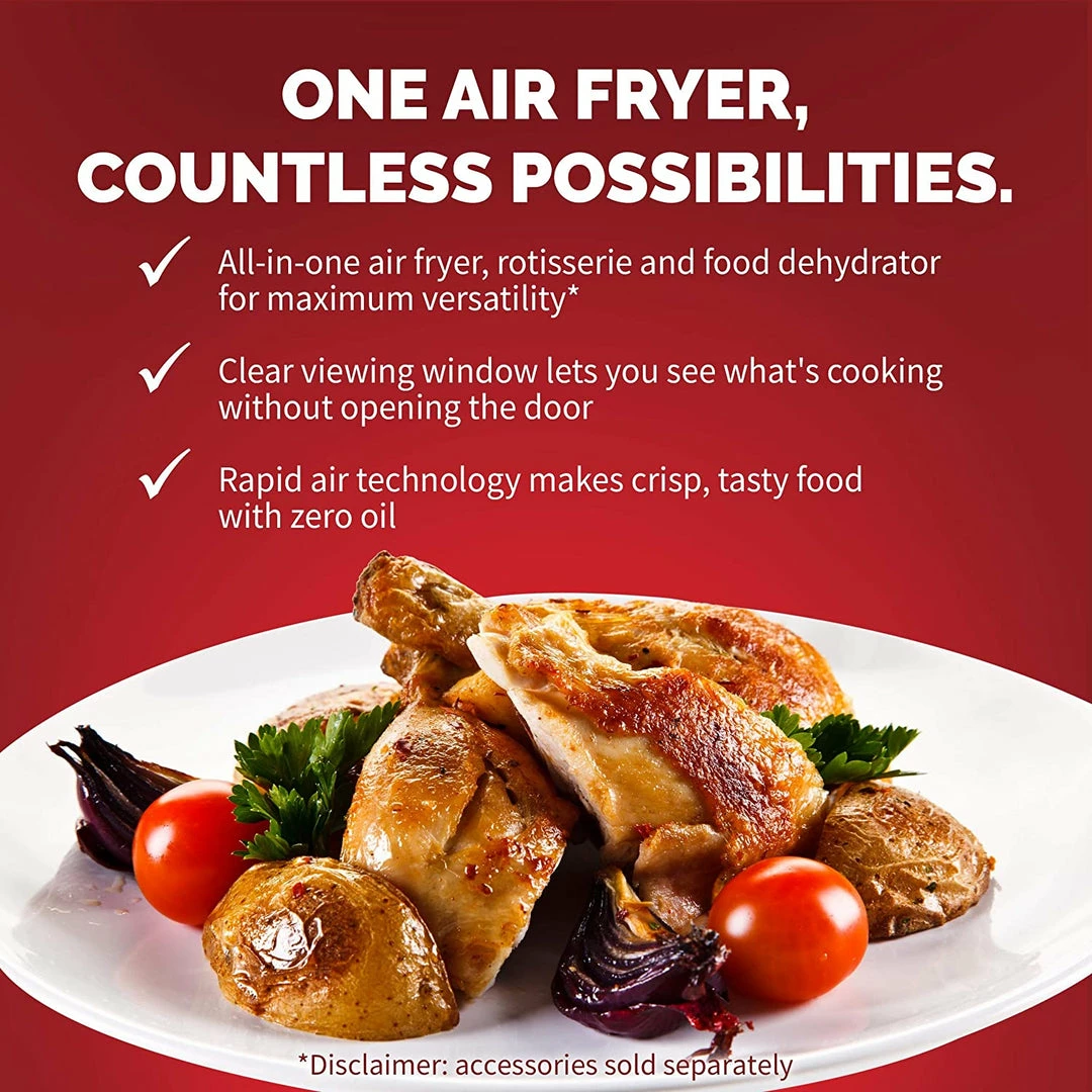 - All-in-one cooking in compact appliance: air fryer, rotisserie, dehydrator, and oven.