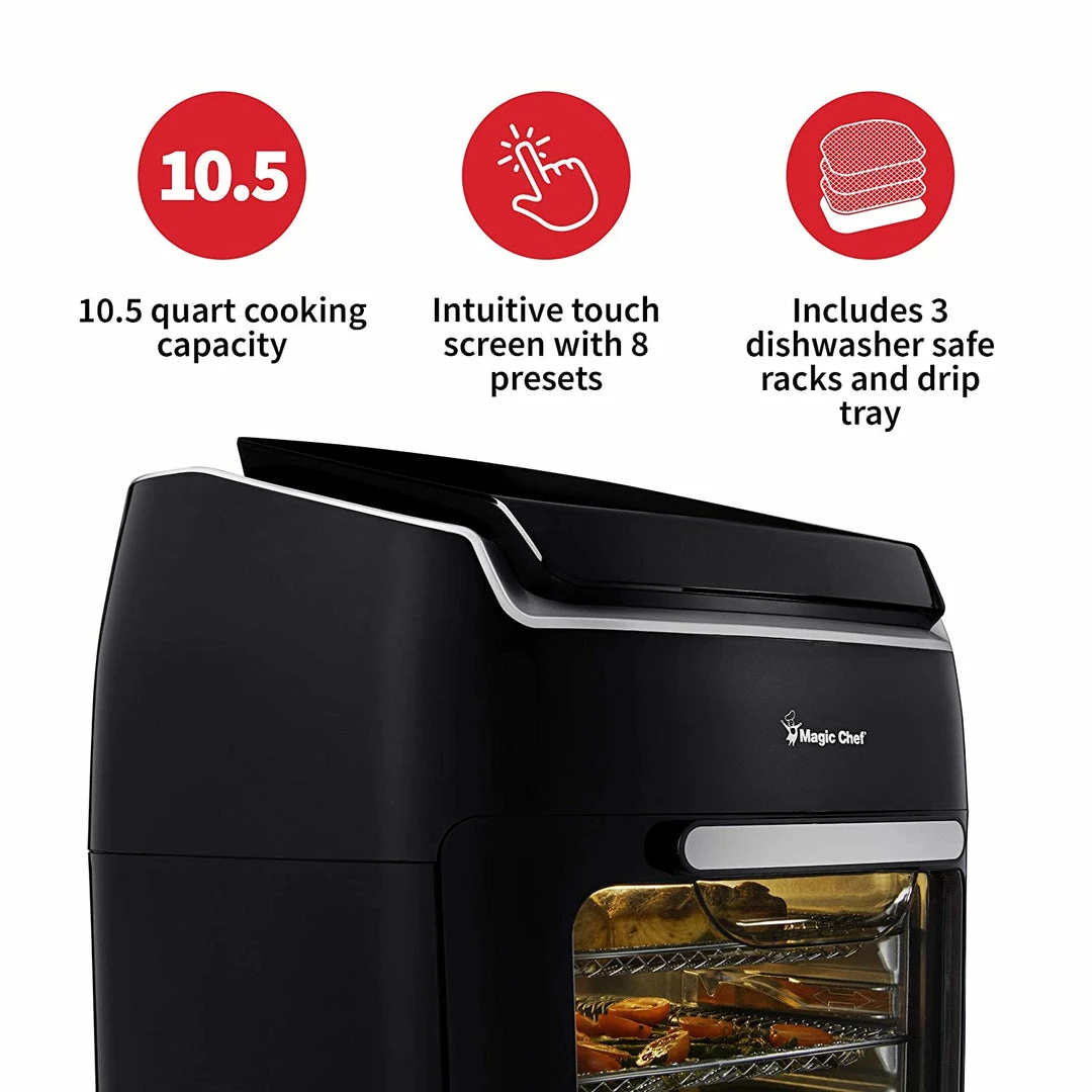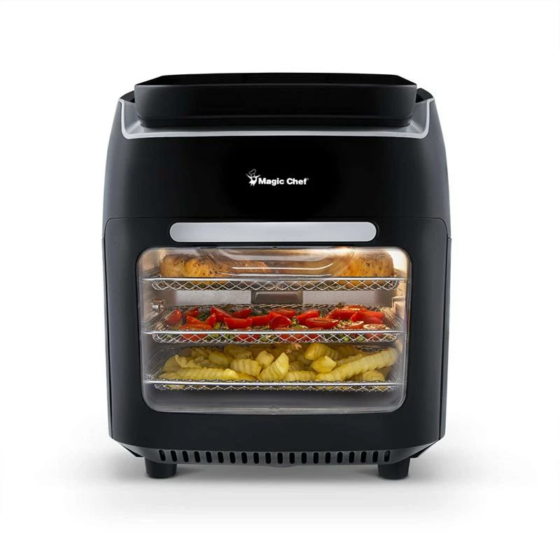 The Magic Chef 10.5 Quart Air Fryer Oven is your most comprehensive cooking companion. Air fry, bake, dehydrate, or roast your – it’s that easy to cook a complete meal in a fraction of the cooking space. This air fryer oven gives you the perfect crisp with none of the excess oil, making it the perfect appliance to match your healthy lifestyle. Intuitive digital controls and cooking presets make it a breeze to use. Don’t worry about cleanup: the 3 lightweight oven racks and removable drip tray are dishwasher safe. This all-in-one cooker will transform the way you cook for your family.