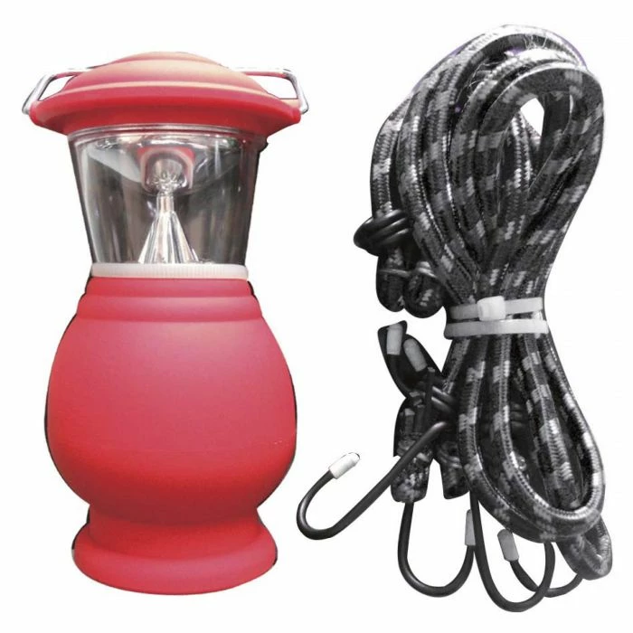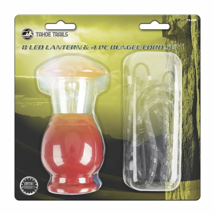 The Tahoe Trails LED Lantern and 4 Piece Bungee Cord Set is designed for the outdoor enthusiast! This set comes with an 8 LED lantern and 4 piece bungee cord set. The lantern has a red painted rubber finish with a chrome finish hanging hook. Great for your next camping trip or any outdoor activity!