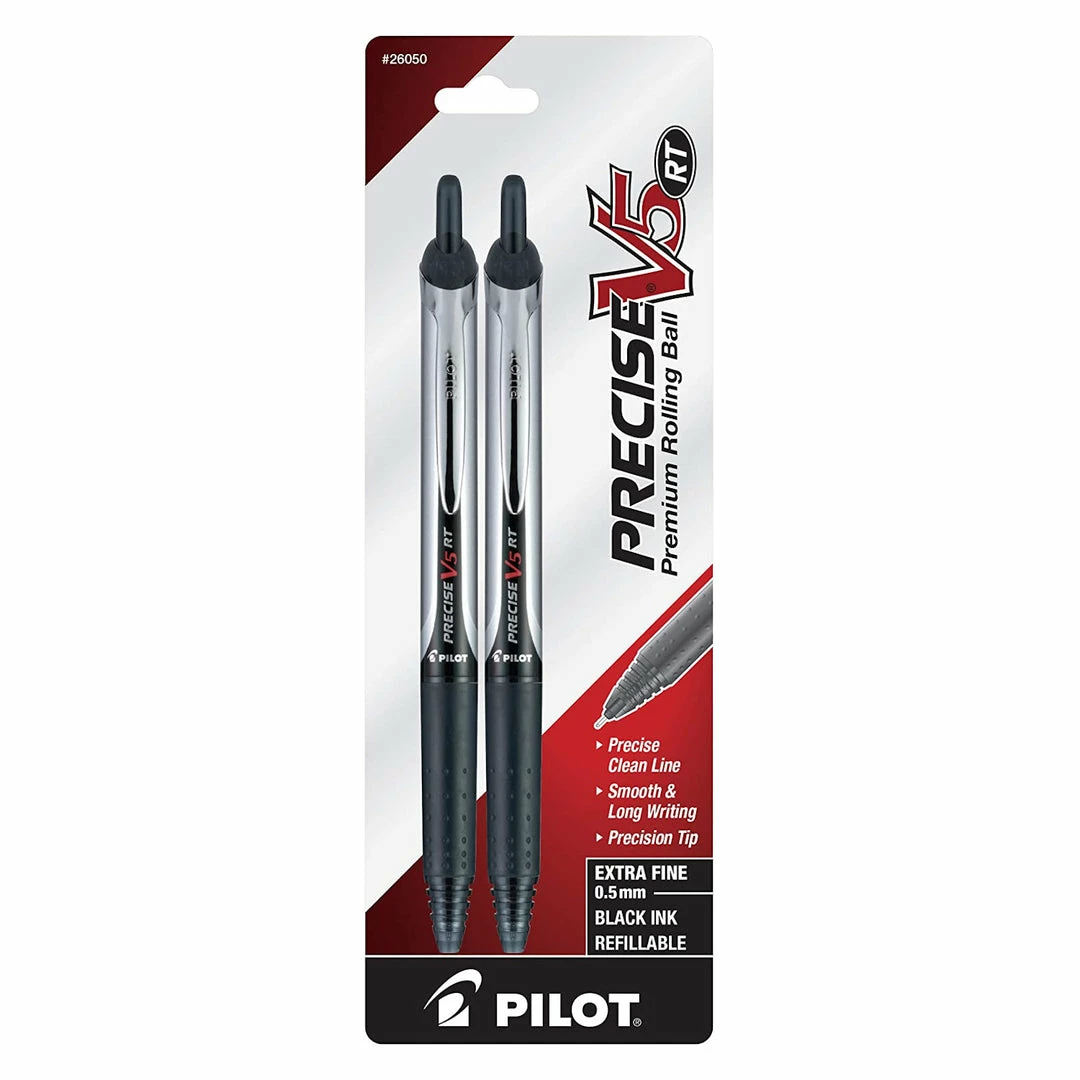 The Pilot Precise V5 Premium Rolling Ball Pen delivers precise clean lines with smooth writing and long lasting ink for unparalleled performance. This value pack includes 2 extra fine (0.5mm) black ink pens. Each pen is retractable and refillable.