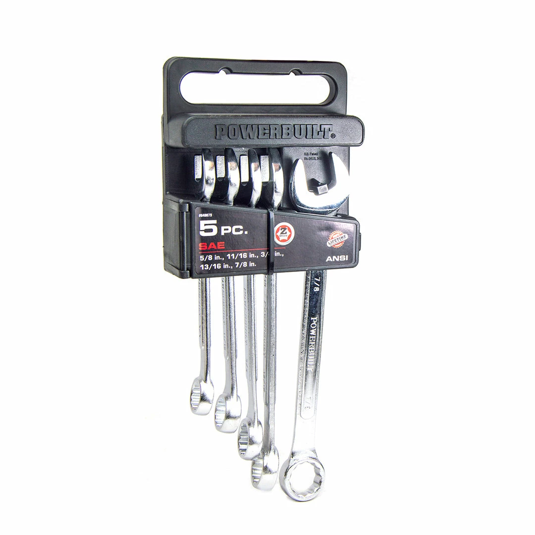 Handle your project with this Powerbuilt 5pc Combination Wrench Set. Made to be the most reliable tools you’ll ever use, this 5 piece, SAE combination wrench set is just what you need for a variety of home DIY applications. With innovative chamfered walls, and Z-Drive box end contacts, you’ll be getting a solid, reliable grip on fasteners, leading to a snug fit, and less frustrating work process.