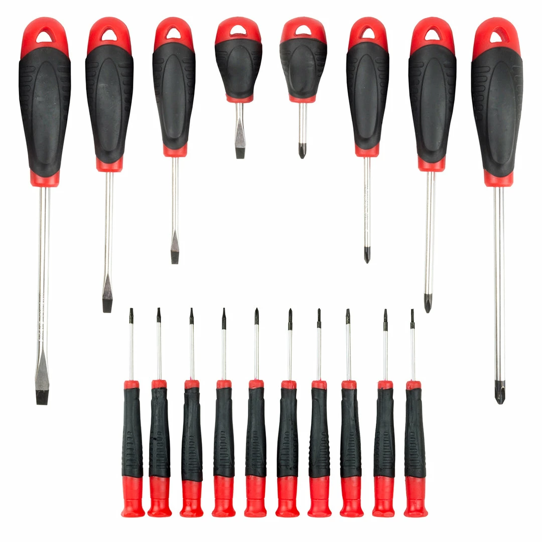 This rugged set has just what you need to get the job done. Always have the tool you need with the PowerXT 18 piece Screwdriver Set. With a combination of Phillips, flathead, star and precision screwdrivers, you can rest easy, knowing that you’ve got the right screwdriver for the job. From construction to mechanics, opening electronics to changing batteries or constructing furniture, the right tool will always be close at hand.
