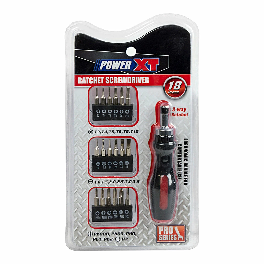 Save big with closeouts on a PowerXT 18-in-1 Ratcheting Screwdriver! WIth its comfortable high-torque grip, and durable, forged ratchet construction, this ratcheting screwdriver is more than up to any task. And with 18 different attachments, you’ll be ready for nearly any situation.
