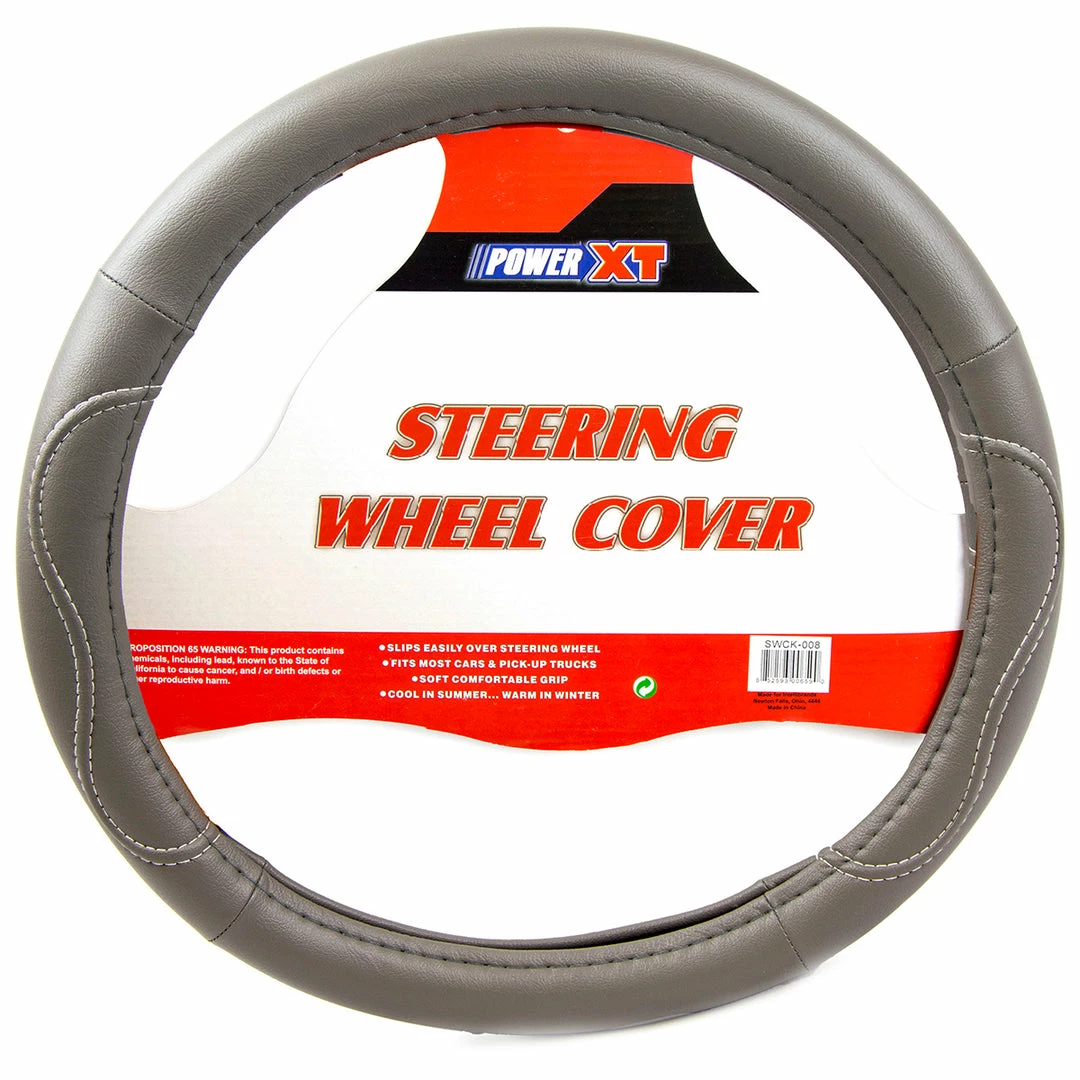 Drive in confidence and class with this PowerXT Steering Wheel Cover. This slick grey steering wheel cover gives your vehicle a distinctive style; and the smooth synthetic leather material feels great in your hands. Perfect for long drives, the stitched contours help you grip the wheel, while keeping your palms comfortable without sacrificing precision. Warm in the winter, and cool in the summer; with factory overstock pricing, thereβs never been a better time to get your hands on one of these slick custom steering wheel covers.