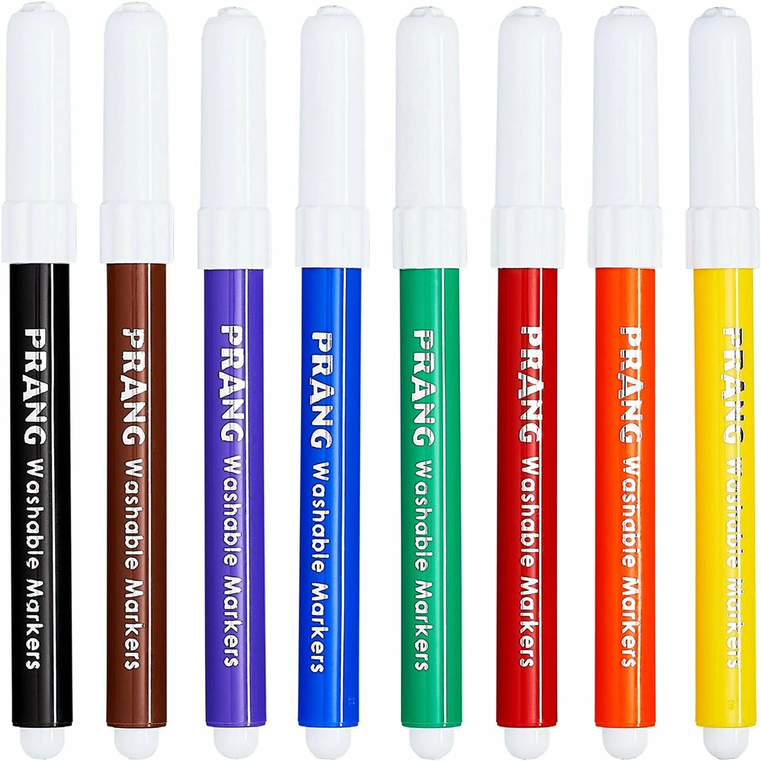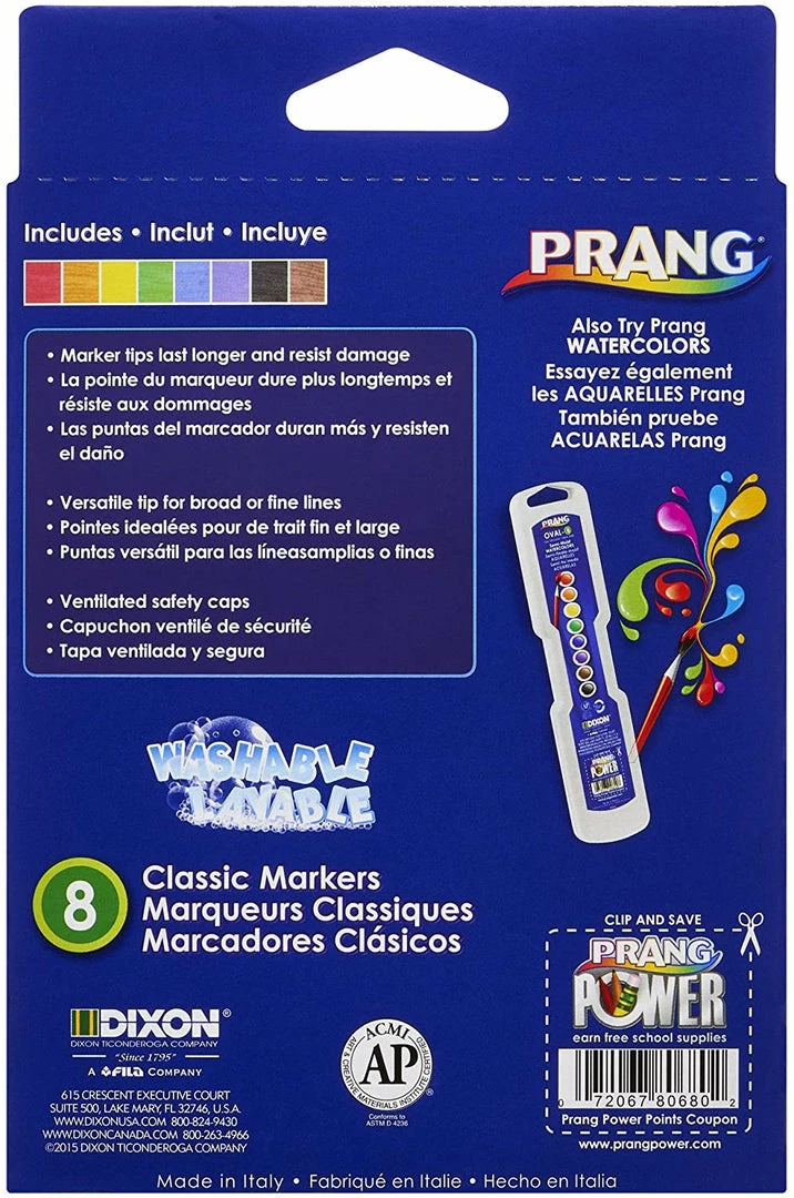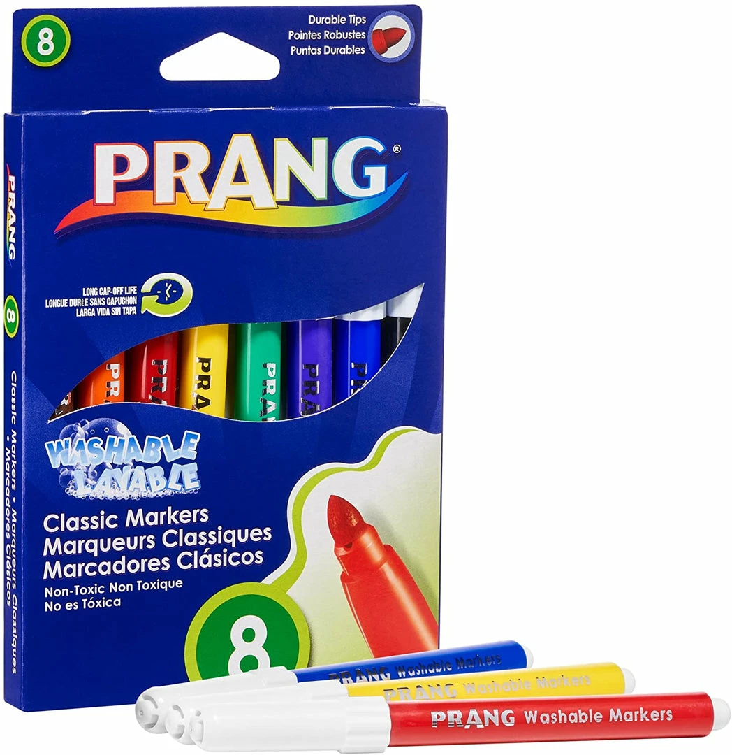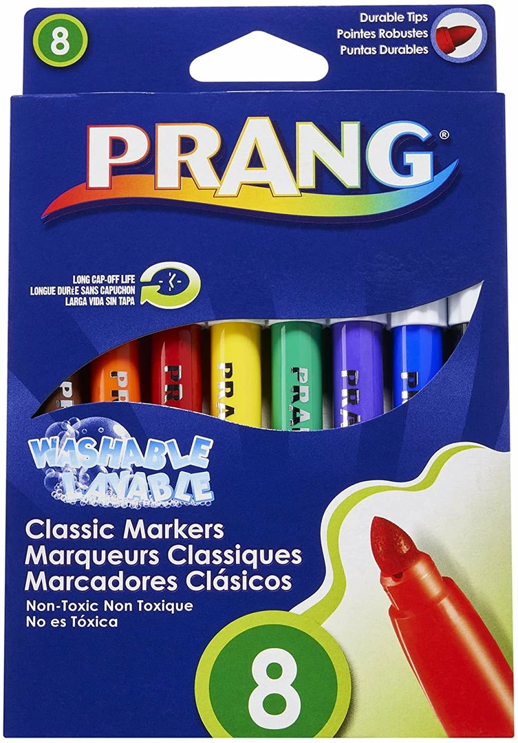Prang classic washable markers come in an 8 count of assorted colors. Prang marker tips last longer and resist damage. These markers have a versatile tip for broad or fine lines. Prang markers are non-toxic, have ventilated caps and a long cap-off life.