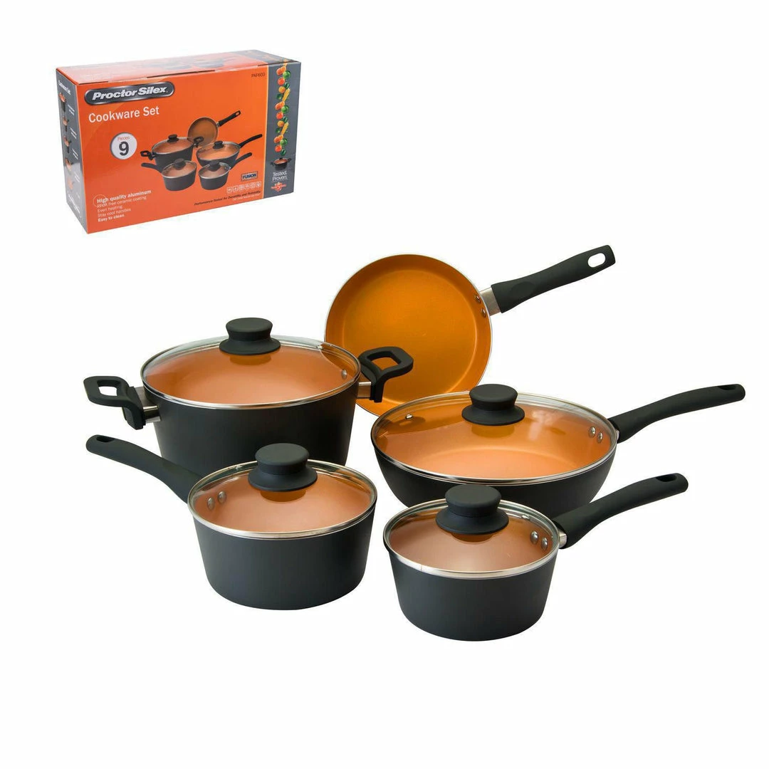 This Stylish 9 Piece Non-Stick Cookware Set from Proctor Silex is the perfect start to building your cooking arsenal! This set is made from aluminum, giving you nice even heating for uniform cooking on your stove top. The set features safe to use stay cool handles and a PFOA free ceramic coating.