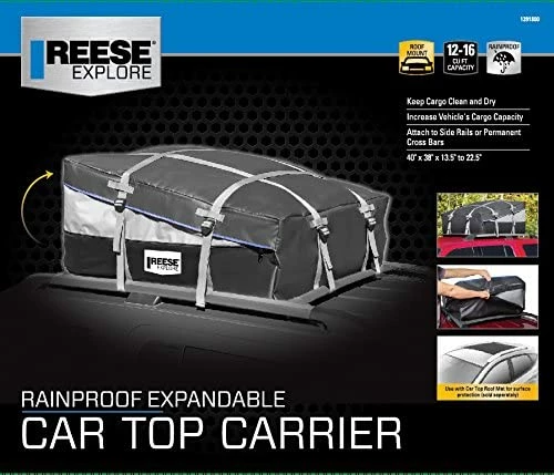 Expand your car’s carrying capacity with a Reese Car Top Carrier! This expandable storage unit is rainproof and can expand from 12 to 16 cubic feet- storing anything from luggage to camping gear and more. The cargo bag uses adjustable straps and secures on side rails or crossbars on your vehicle.