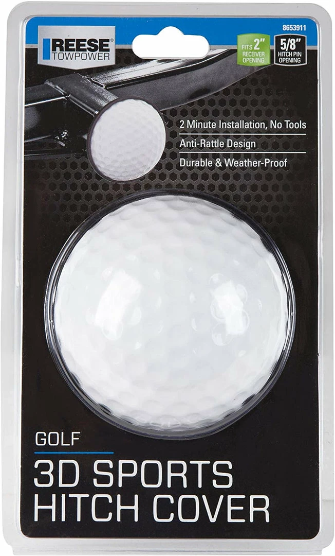The REESE Towpower 3D Sport series of hitch covers allows you to show your enthusiasm and interest when you are not towing. Cover that rusty 2 In. ball mount opening with the golf ball hitch cover designed to let everyone know your favorite sport or that of your family. The hitch cover has the shape of a golf ball including the seams and texture.