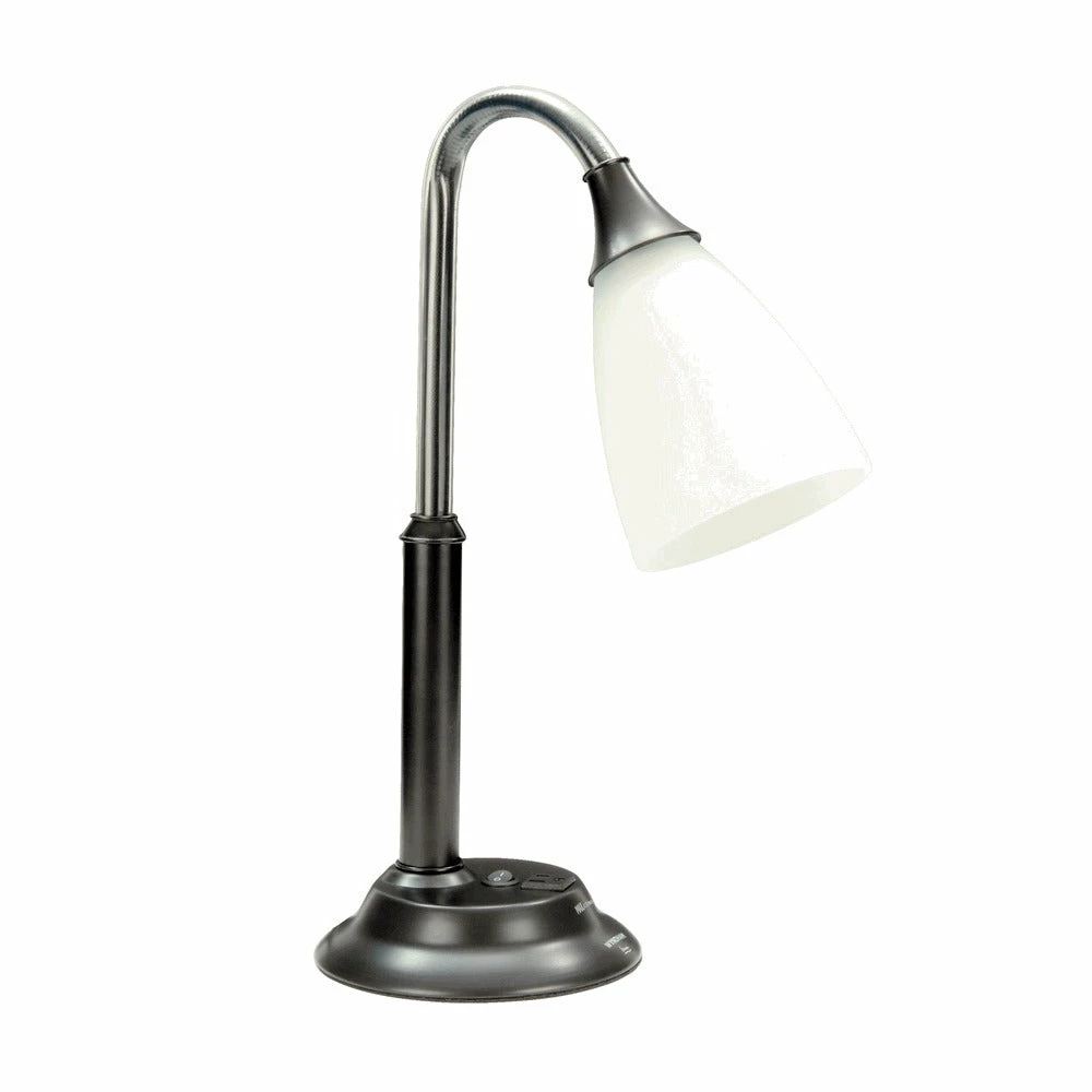 Illuminate your bedside with a Royal Gooseneck Nightstand Task Lamp! This elegantly designed lamp features a flexible neck that allows you to customize light direction for ideal illumination. The base is also weighted to provide added stability, regardless of how you pose the neck. It carries a built in AC outlet, which is perfect for charging devices at night.