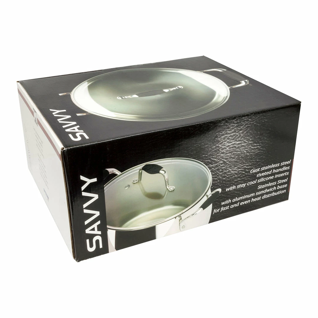 Cook up some savings with factory closeouts on a Savvy Dutch Oven! With its non-stick interior and easy to grip, stay-cool silicone handles, this 5-quart saucepan is perfect for searing and braising meats, browning meats for savory stews, and preparing your favorite soups, stews, and chili. And with its scratch-resistant and easy to clean stainless steel construction, you’ll enjoy cooking with this saucepan for years to come.