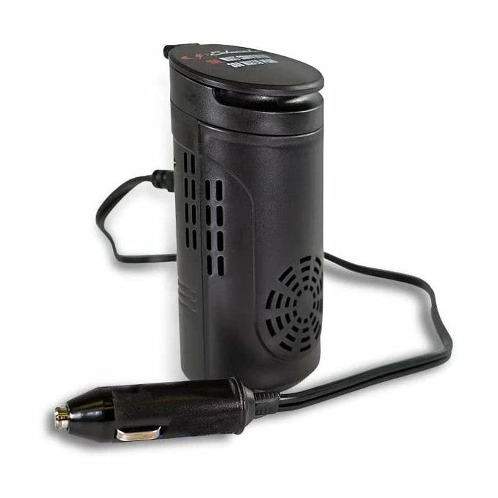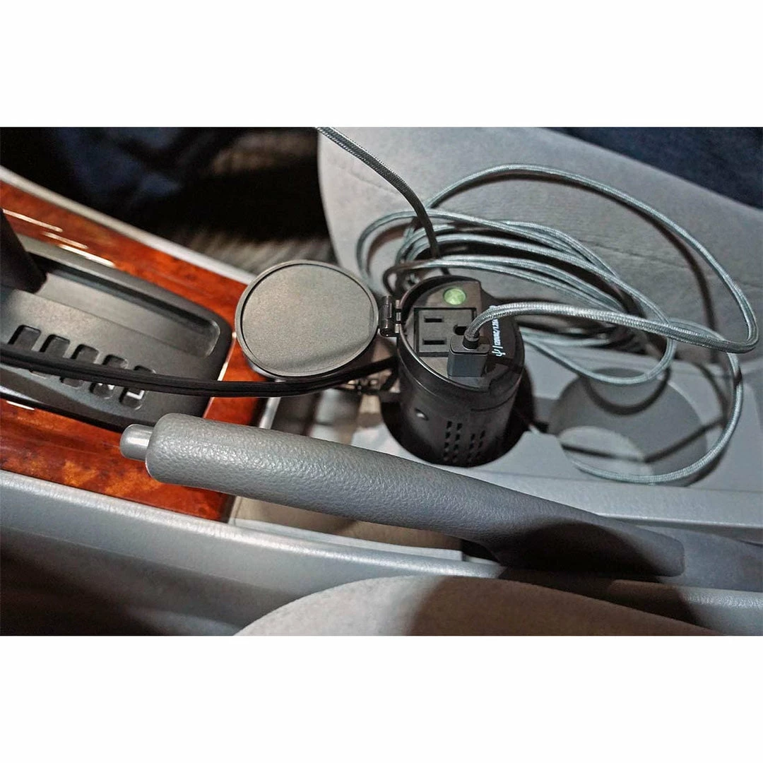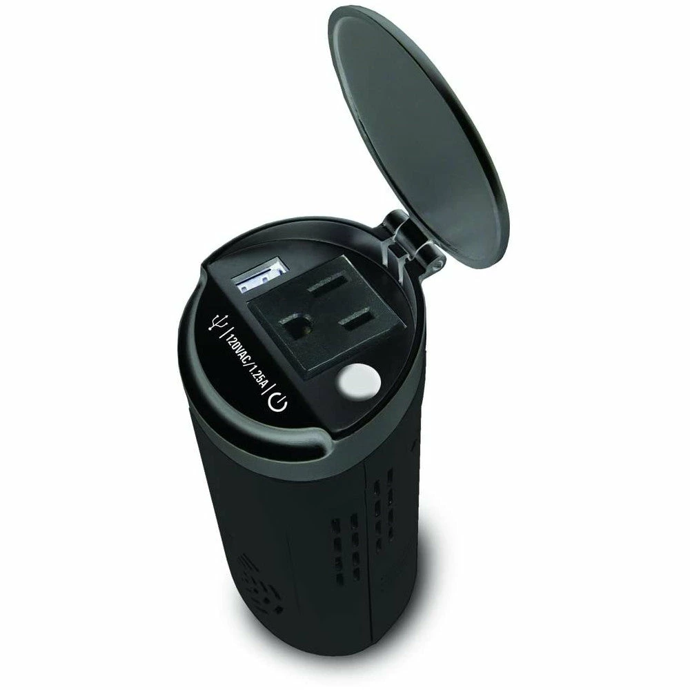 Turn battery power into household power with a Schumacher 150 Watt Power Converter! This converter is specially designed for convenient use while on the road, fitting right into your car’s cup holder. It has 300 peak watts and features an AC outlet and a 2A USB port. Includes a DC adapter for your car and a user manual.