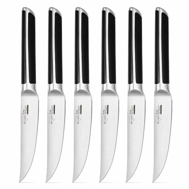 Cut your steaks and other meals with ease with a Sky Light Steak Knife Set! This set comes with 6 German stainless steel steak knives that will cut your steaks with damaging or negatively affecting the flavors like a serrated knife will. They feature ABS handles with an inverted triangle design, making them ergonomic and easy to use.